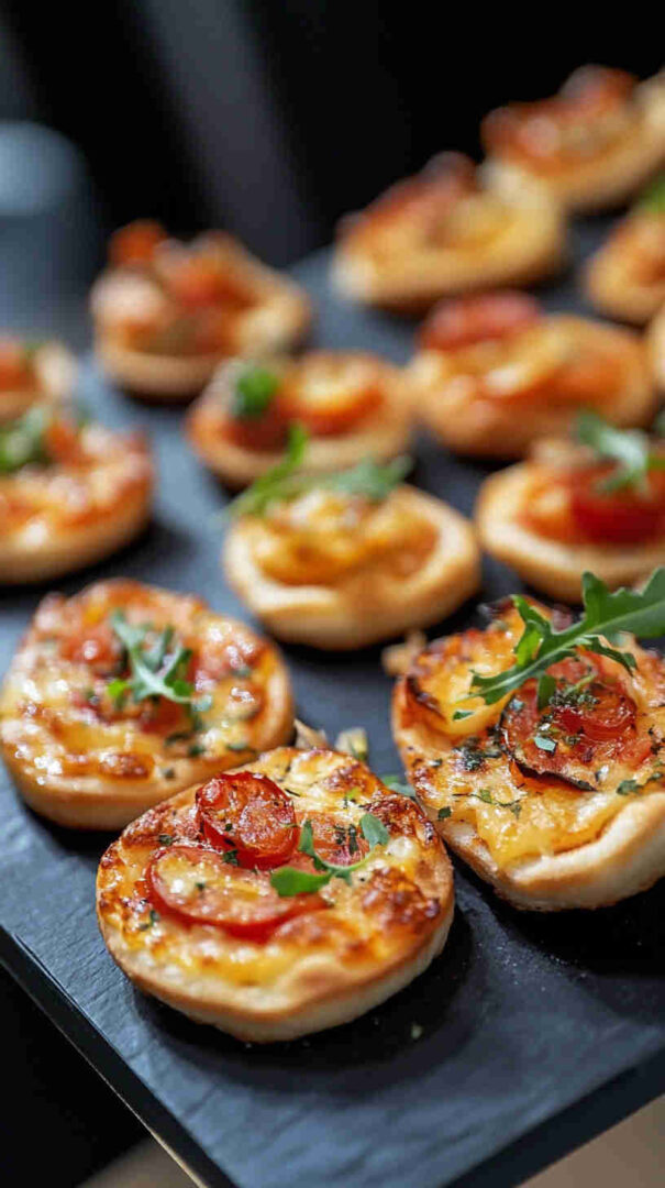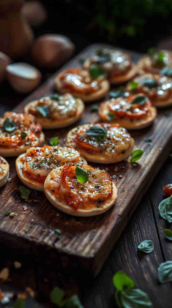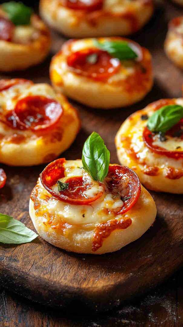 Cheesy, saucy mini pizzas with pepperoni on golden dough—irresistible Italian bite-sized appetizers!