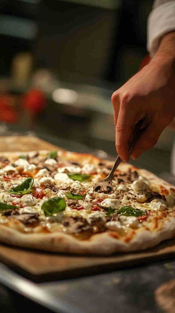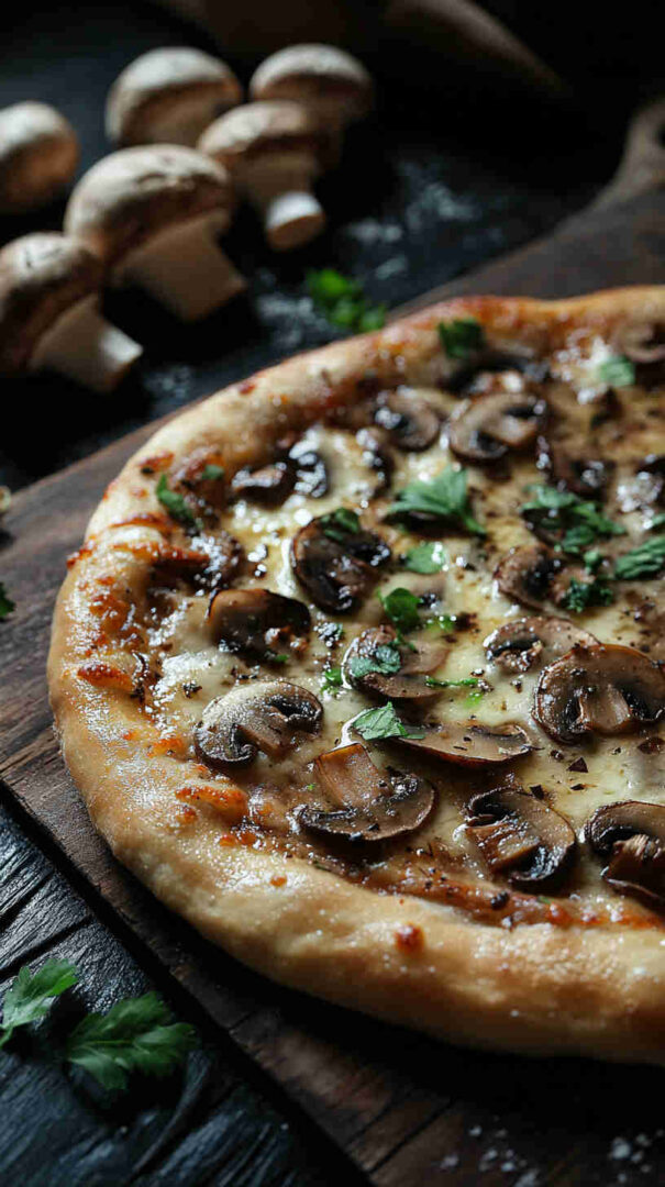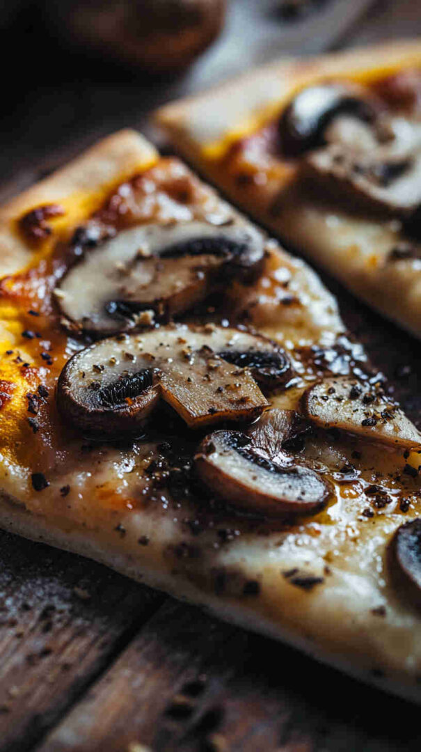Truffle oil is potent—start with less and add more to taste. Always drizzle after baking to keep its delicate flavor intact. This is a white pizza, so no tomato sauce needed—the mushrooms and cheese shine!
