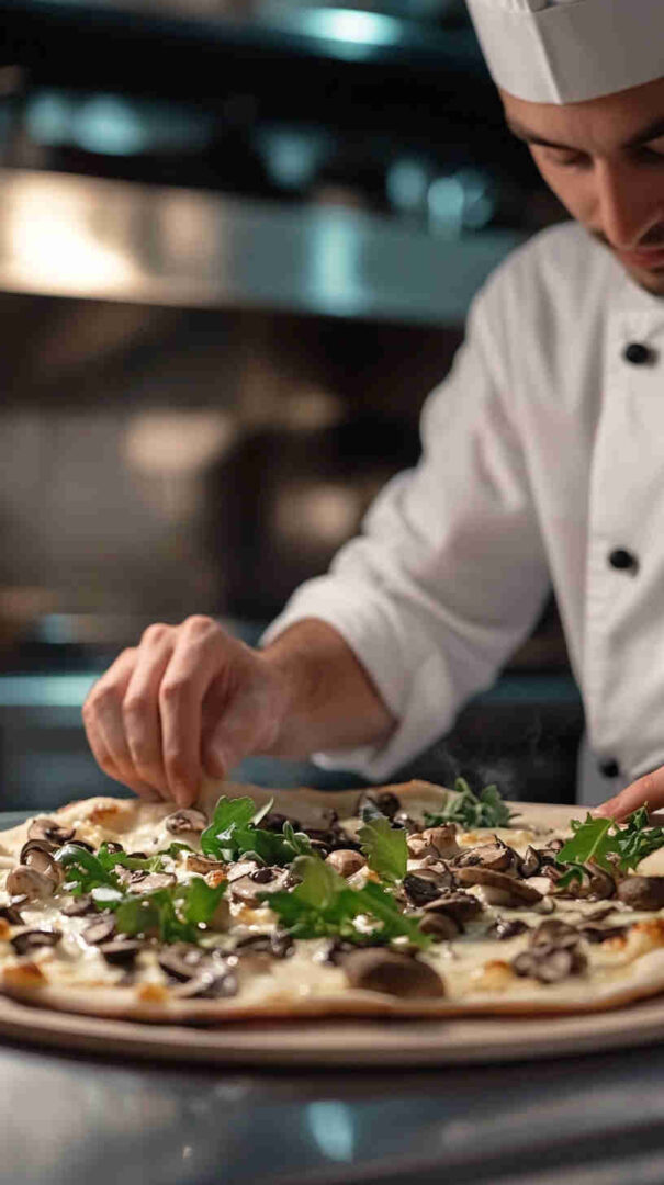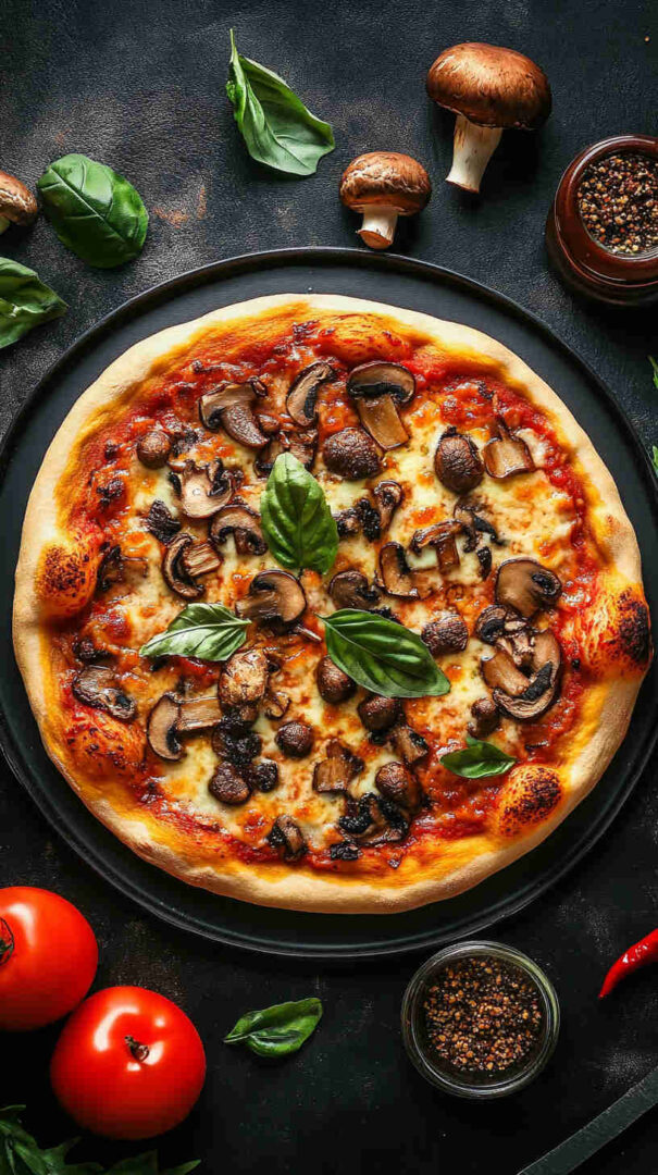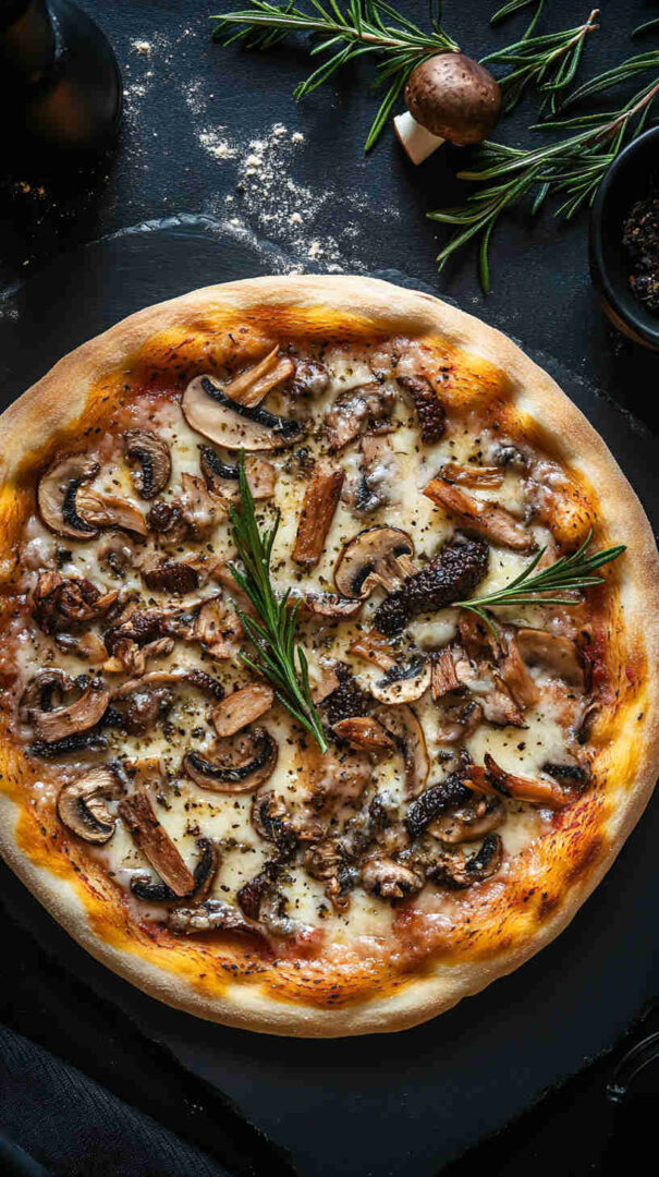 Earthy mushrooms, melty cheeses, and luxurious truffle oil on crispy crust—an elegant Italian white pizza delight.