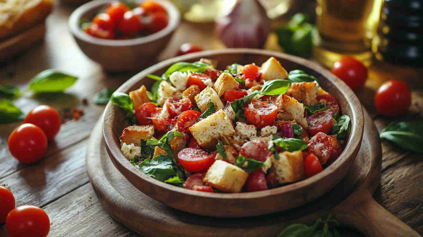 - Let it marry — Let the salad sit at room temperature for 10–30 minutes. This allows the bread to absorb flavors while still retaining some chew—stir once halfway through.