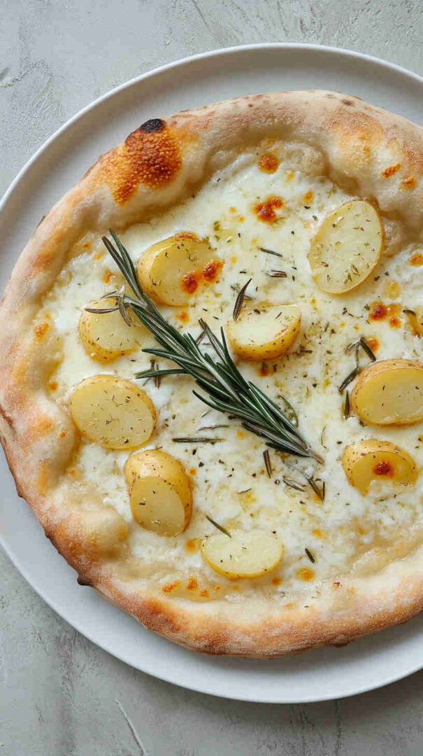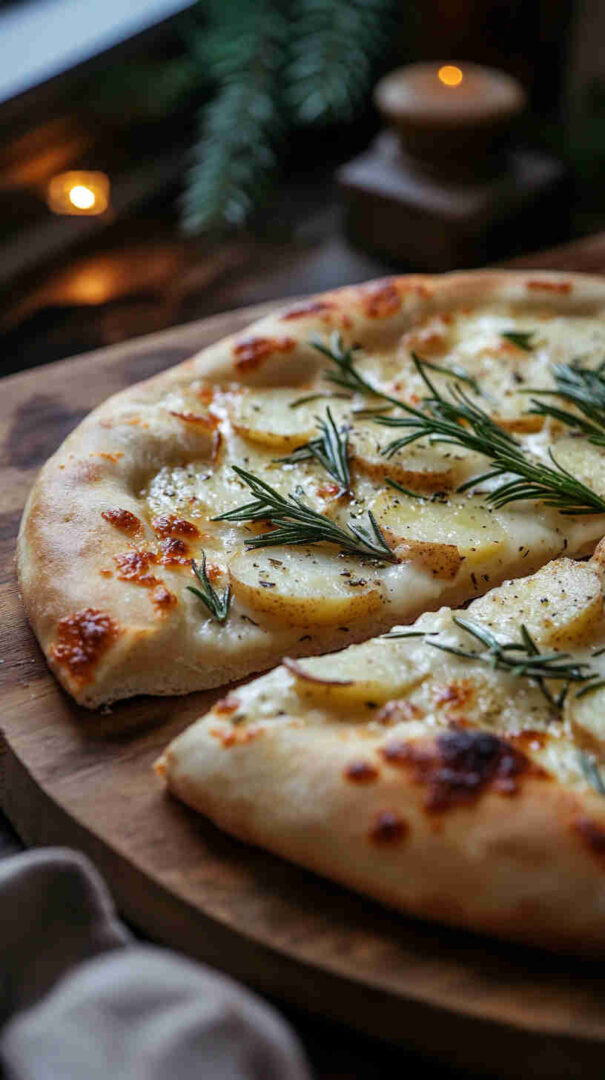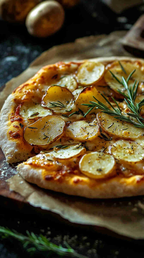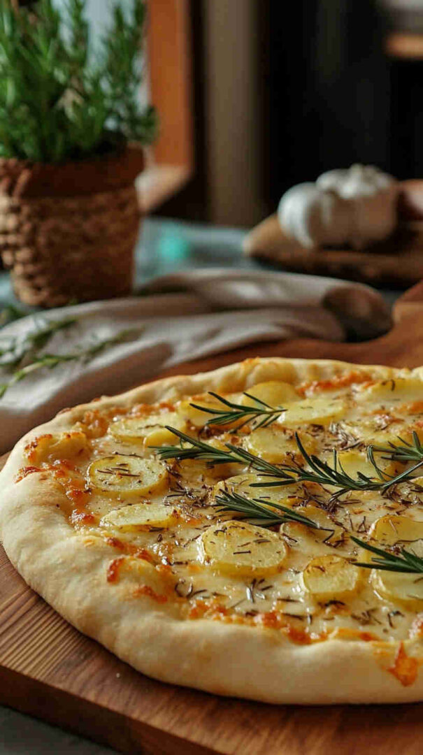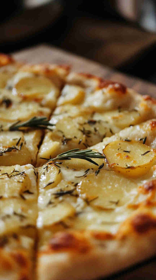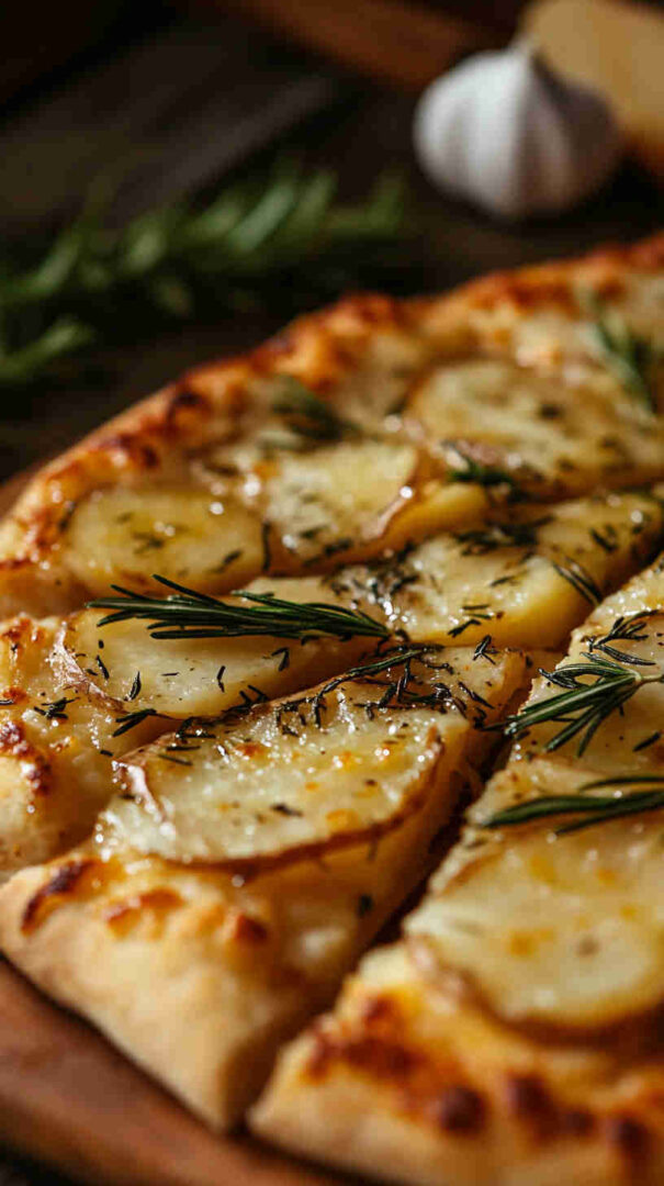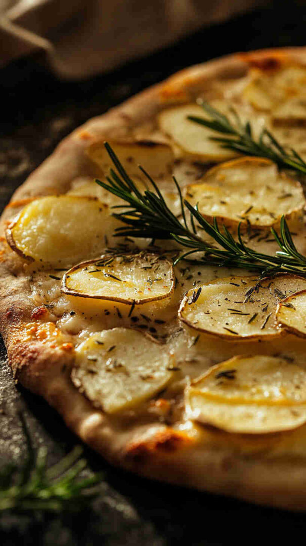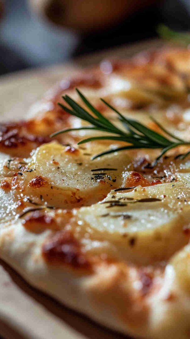 Crispy thin-crust pizza topped with sliced potatoes, fresh rosemary, and olive oil—a simple, aromatic Italian classic.
