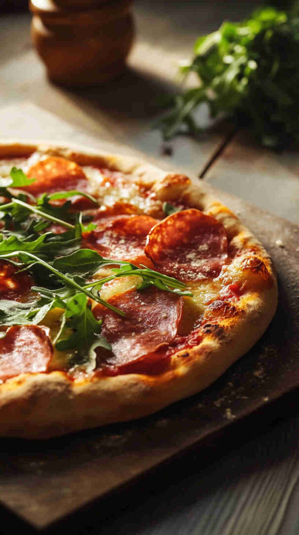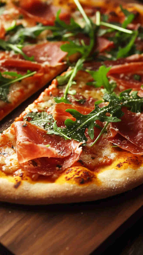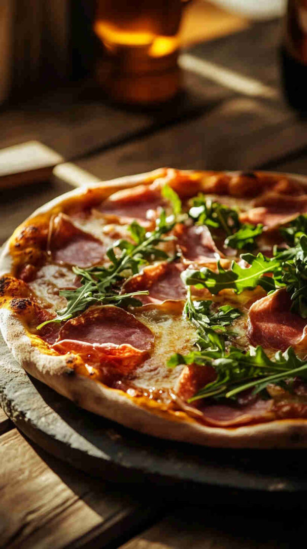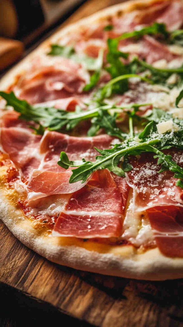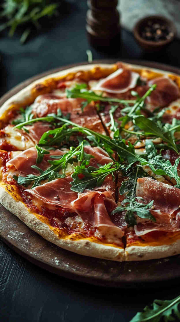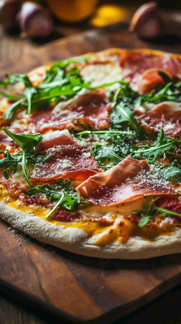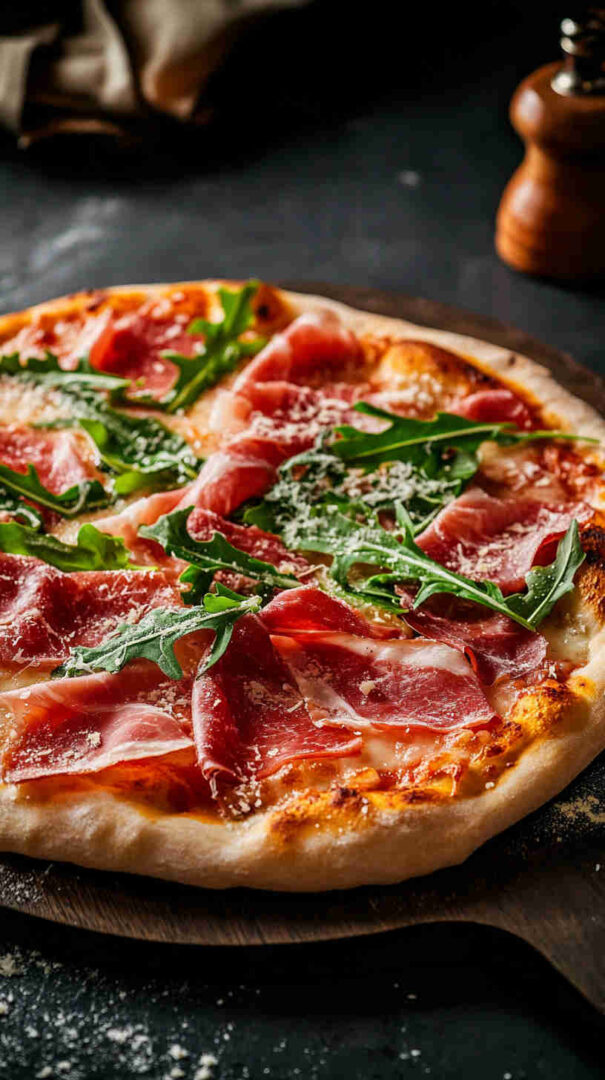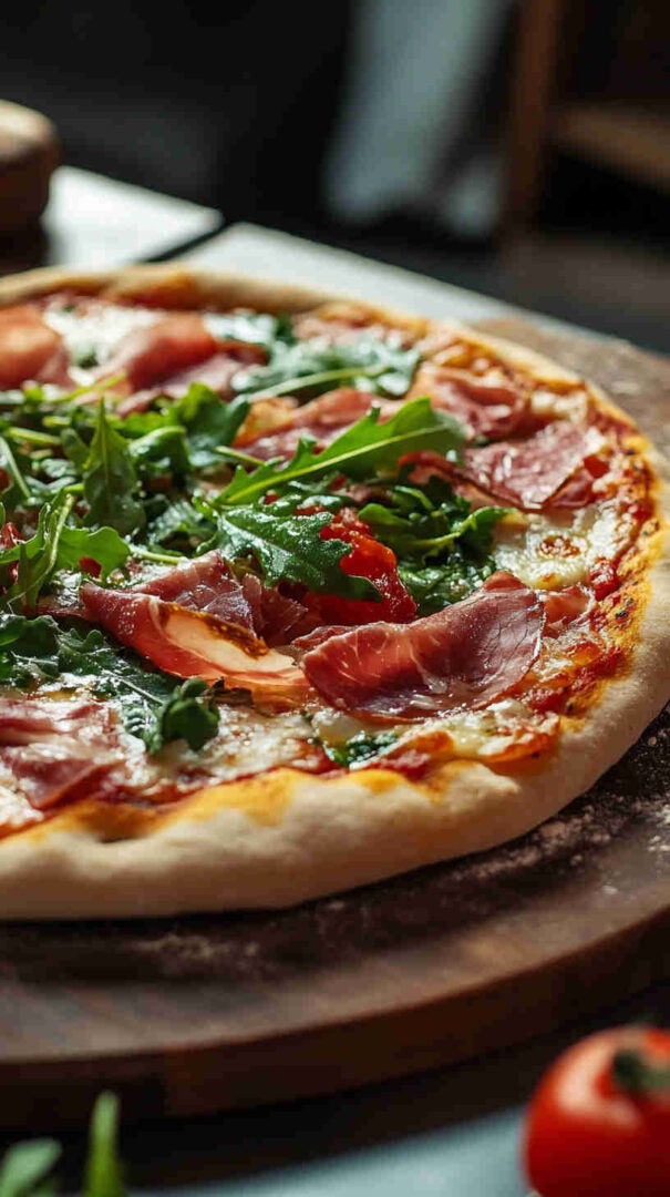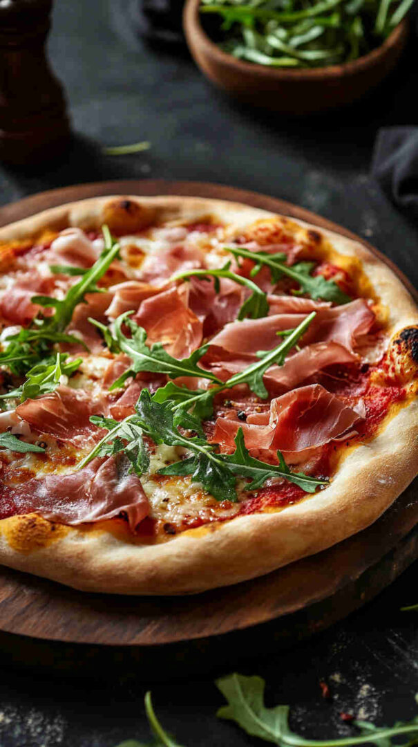 This classic Italian Prosciutto and Arugula Pizza (also known as Prosciutto e Rucola) features a thin, crispy crust topped with simple tomato sauce, melted mozzarella, delicate slices of salty prosciutto, and a fresh pile of peppery arugula added after baking for vibrant contrast. It’s light yet satisfying, highlighting high-quality Italian ingredients in an elegant, no-fuss way. (48 words)