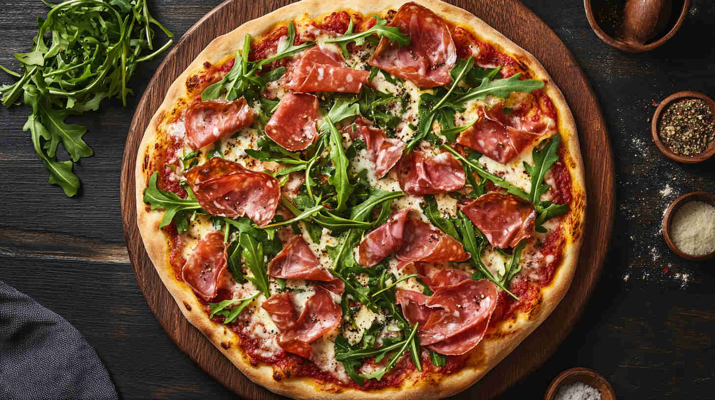 This classic Italian Prosciutto and Arugula Pizza (also known as Prosciutto e Rucola) features a thin, crispy crust topped with simple tomato sauce, melted mozzarella, delicate slices of salty prosciutto, and a fresh pile of peppery arugula added after baking for vibrant contrast. It’s light yet satisfying, highlighting high-quality Italian ingredients in an elegant, no-fuss way. (48 words)