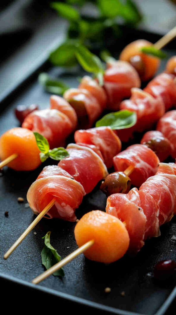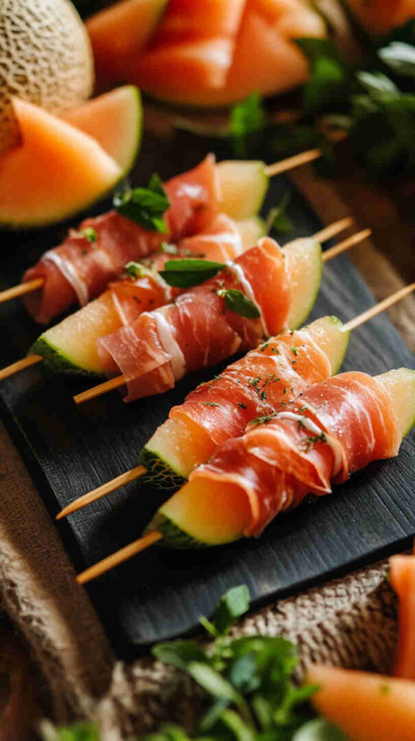 Sweet melon wrapped in salty prosciutto, skewered with mint and balsamic—elegant Italian bites!