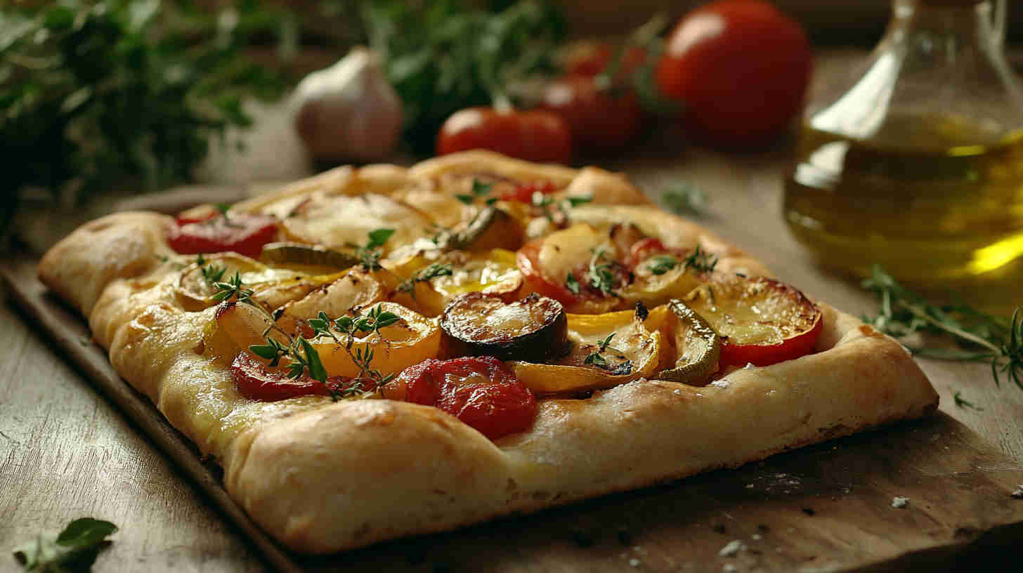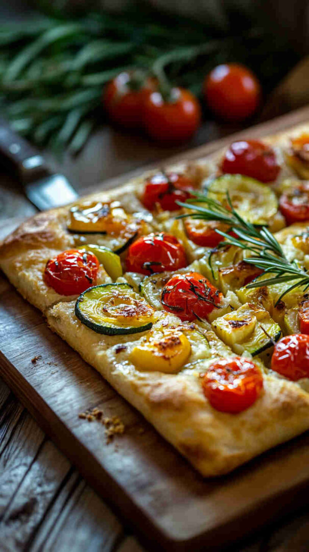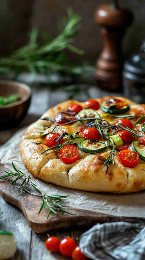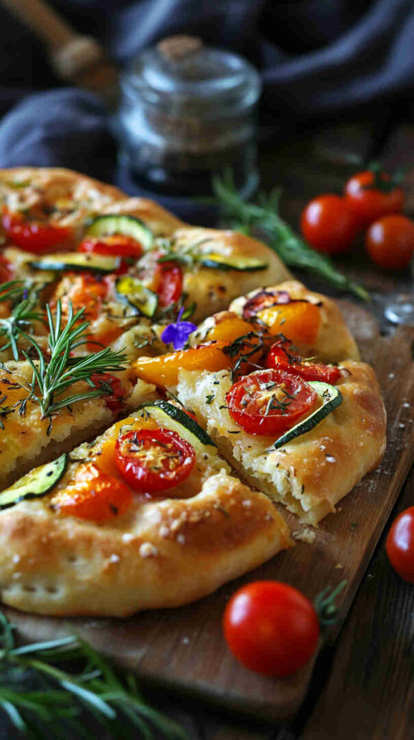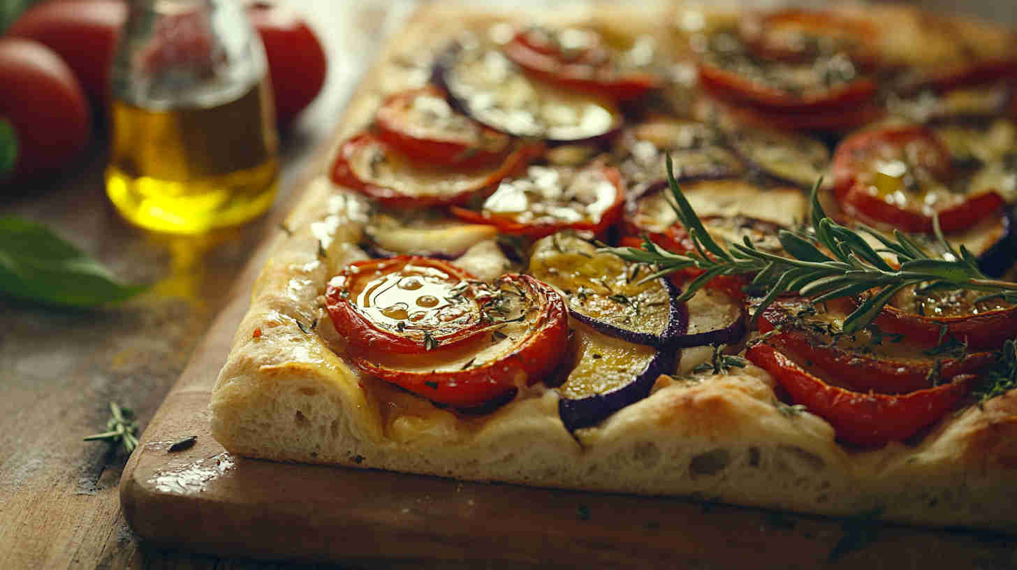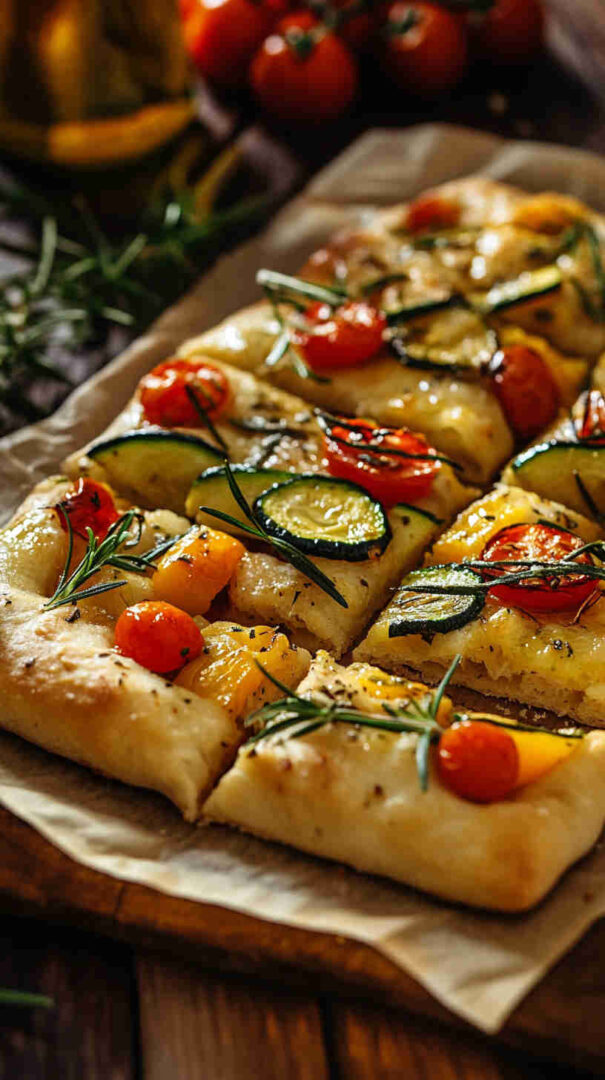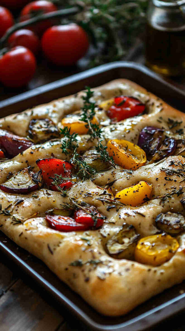 Fluffy focaccia topped with roasted colorful vegetables, rosemary, and olive oil—rustic Italian perfection.
