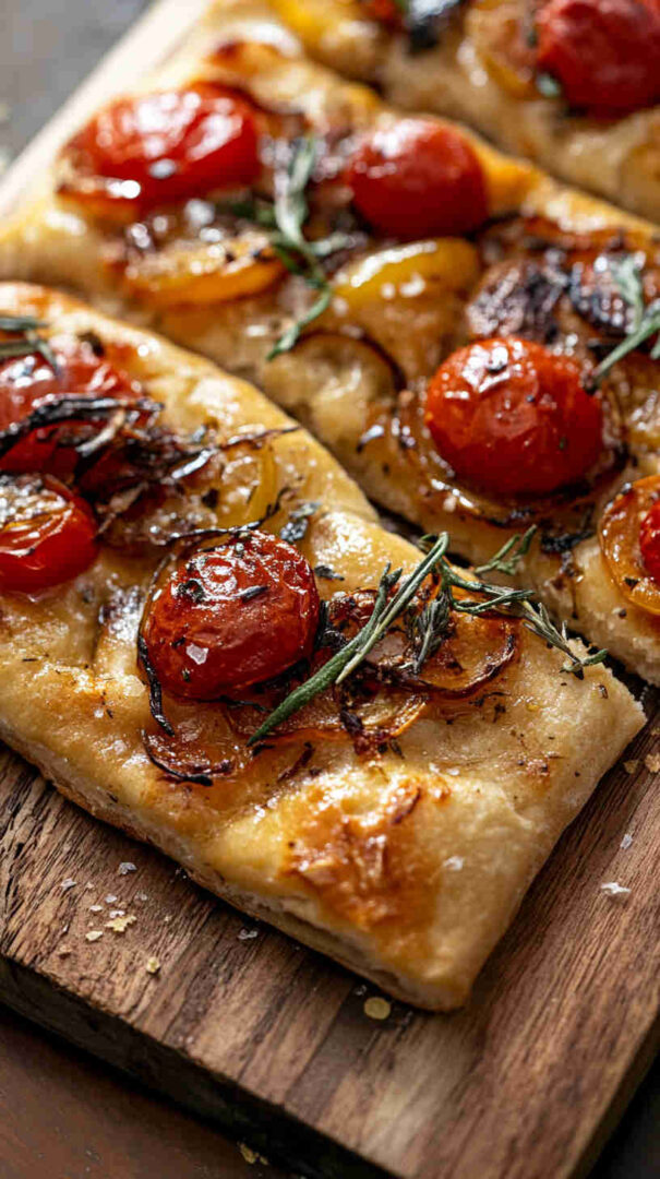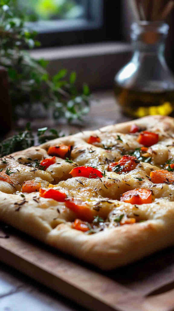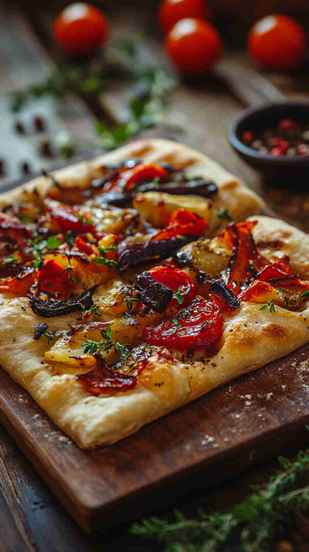 Use plenty of olive oil—it’s the soul of good focaccia. Dough can be made a day ahead—refrigerate after first rise and bring to room temp before shaping. Roast extra veggies for snacking. Naturally vegan.