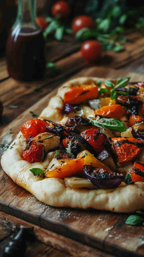 High-quality bread flour or Tipo 00 creates the classic chewy, open-crumb structure. Extra-virgin olive oil is non-negotiable—use a fruity, peppery one for both dough and drizzling. Fresh vegetables (bell peppers, zucchini, eggplant, red onion, cherry tomatoes) roast beautifully, concentrating flavor and adding vibrant color.