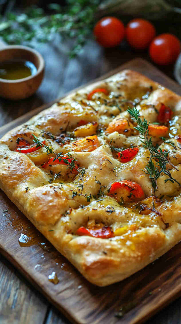 Every bite delivers that signature focaccia chew, salty olive oil crust, and bursts of roasted vegetable goodness—pure Italian comfort. It’s naturally vegetarian (vegan-adaptable), uses seasonal produce, looks stunning on any table, and doubles as sandwich bread the next day.