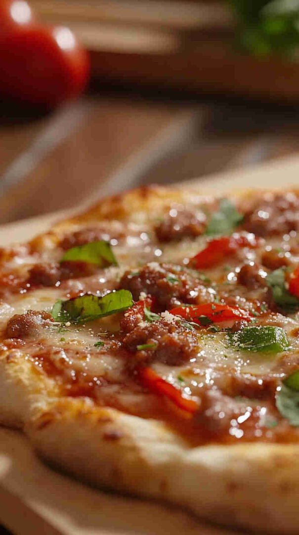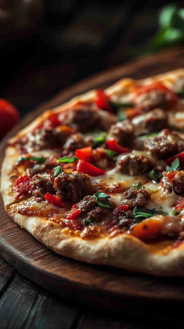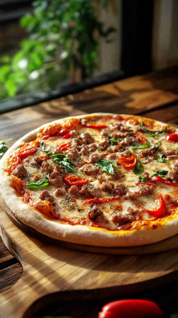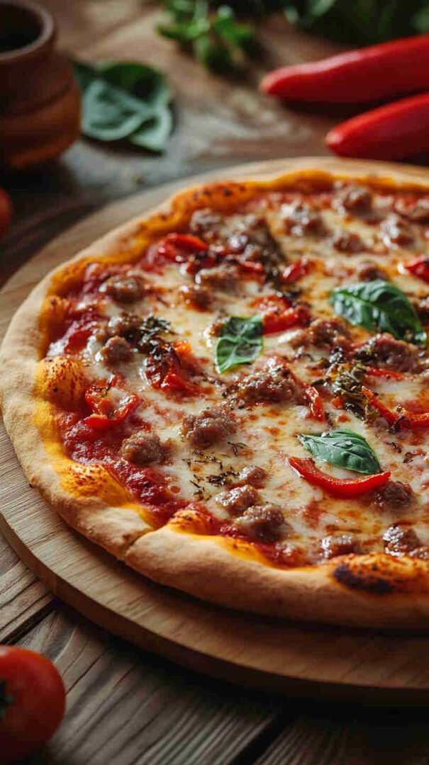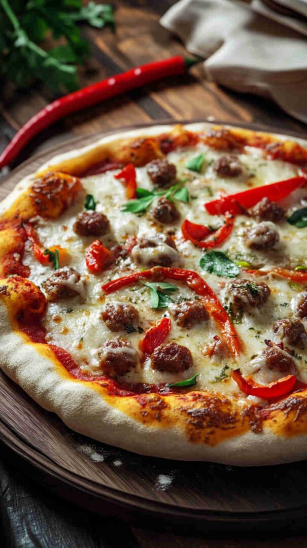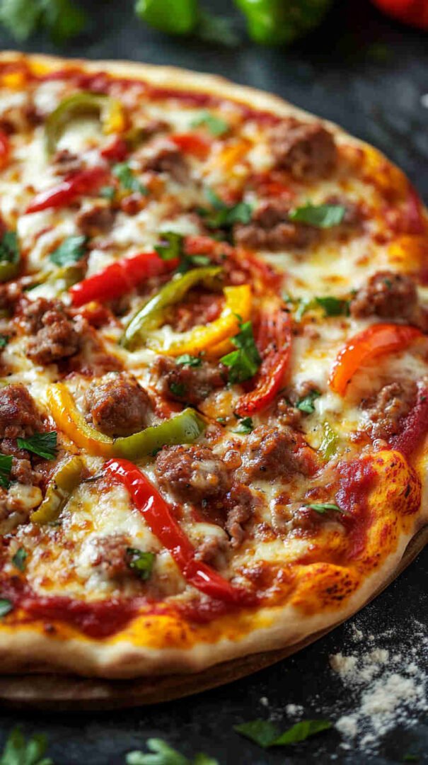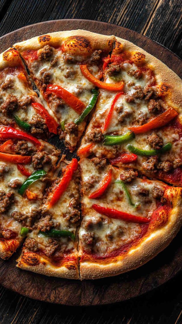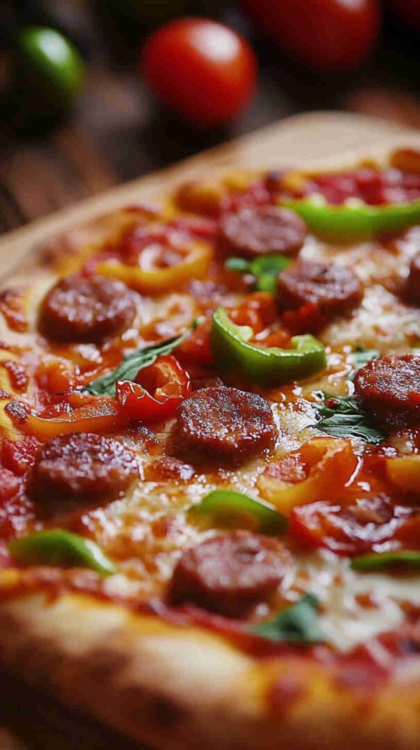 Hearty Italian sausage, colorful peppers, onions, and melty cheese on crispy crust—a festive twist on a classic!