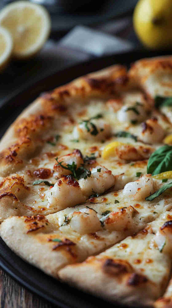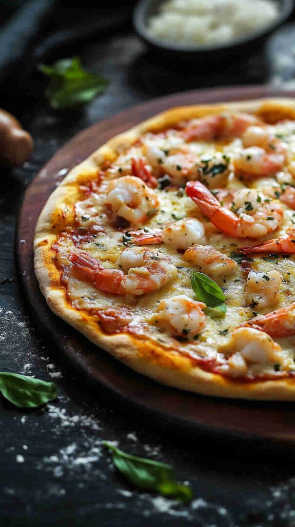 Best enjoyed fresh, but leftovers keep in an airtight container in the fridge for up to 2 days. Reheat in a hot oven (400°F/200°C) for 5–8 minutes to crisp the crust—avoid microwave to prevent sogginess. Freezing isn’t ideal due to seafood texture changes, but if needed, freeze unbaked topped pizza (wrap tightly) and bake from frozen, adding extra time.