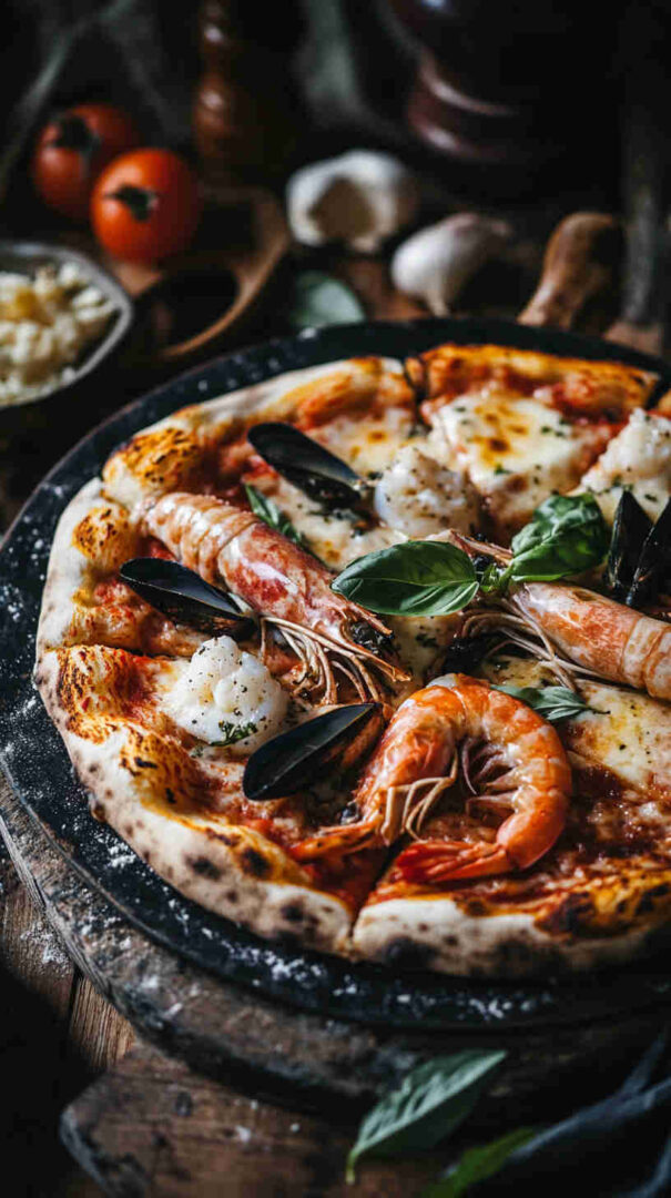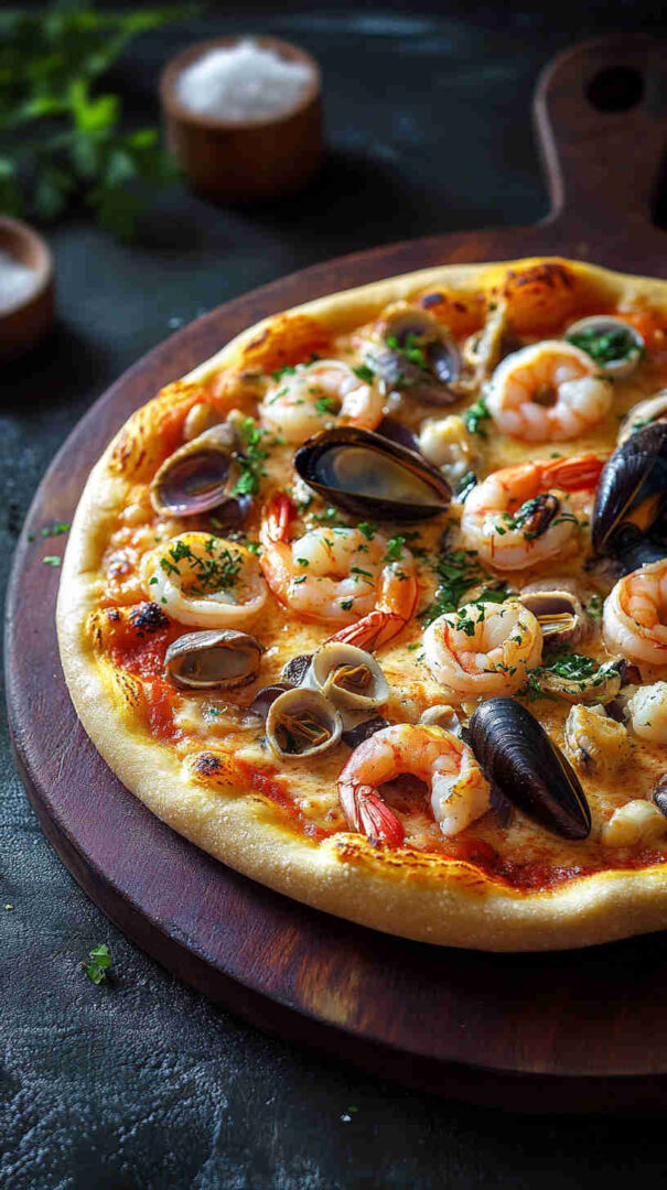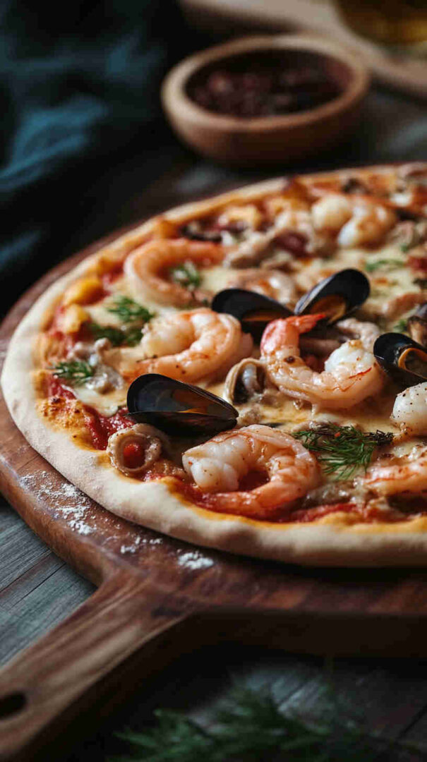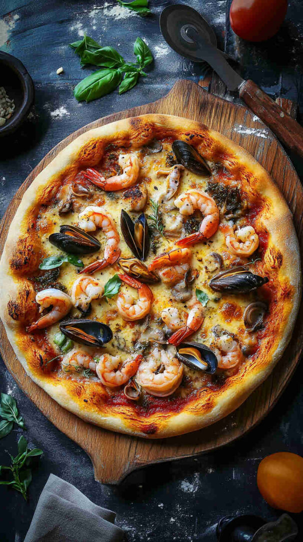 For the best results, opt for Italian “00” flour if available—it gives a tender, authentic Neapolitan-style crust with great chew. Fresh or high-quality frozen seafood is key; shrimp should be peeled and deveined, calamari cleaned and sliced into rings, and shellfish like mussels/clams steamed open and shelled (discard any that don’t open).
