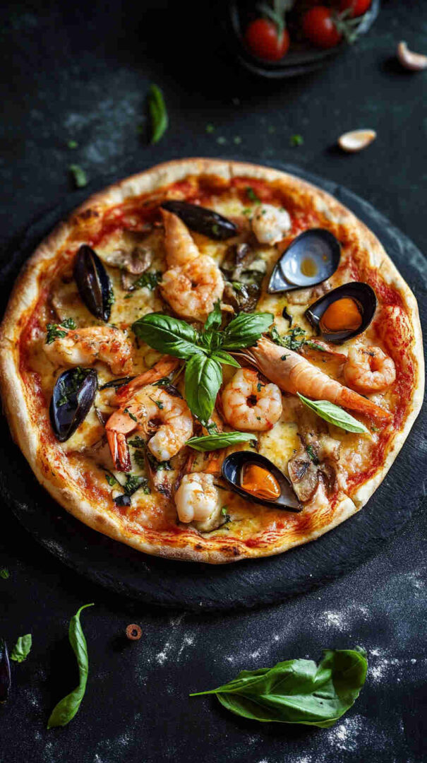 Crispy crust topped with fresh shrimp, calamari, mussels in light tomato sauce—elegant Italian seafood pizza perfection.