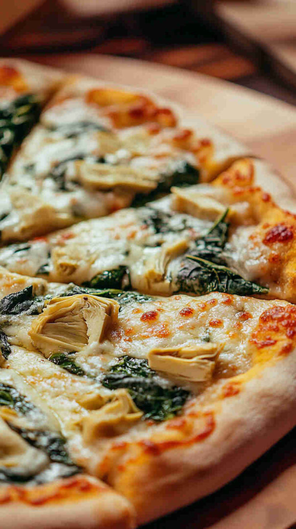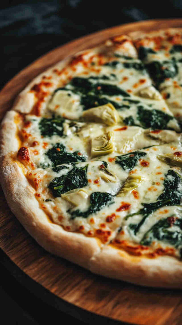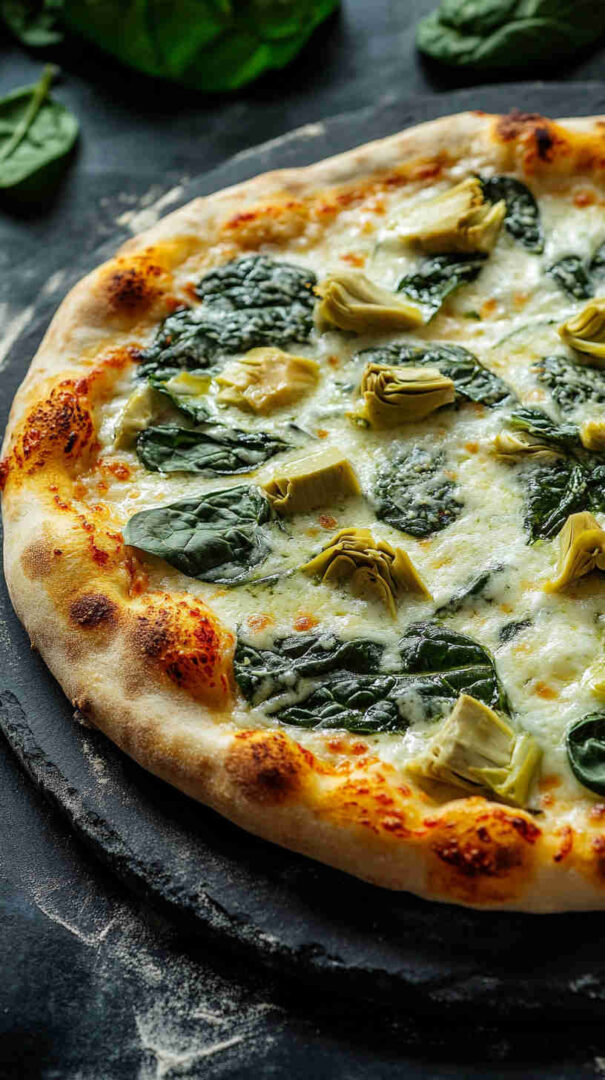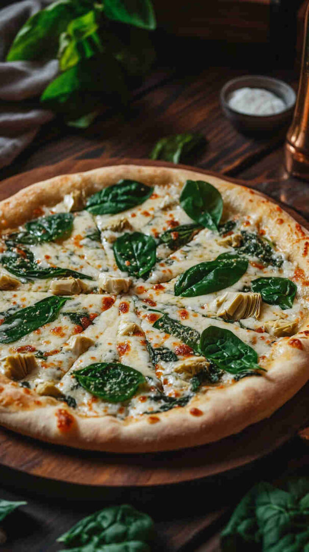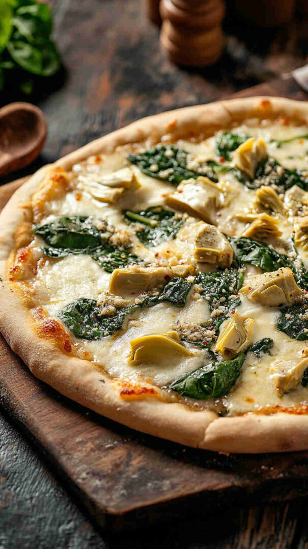 Creamy white pizza with spinach, artichokes, garlic, and three cheeses on crispy Italian crust—vegetarian bliss!