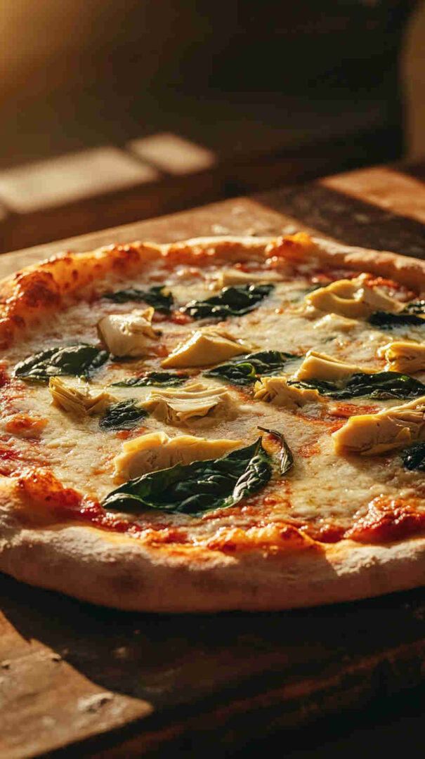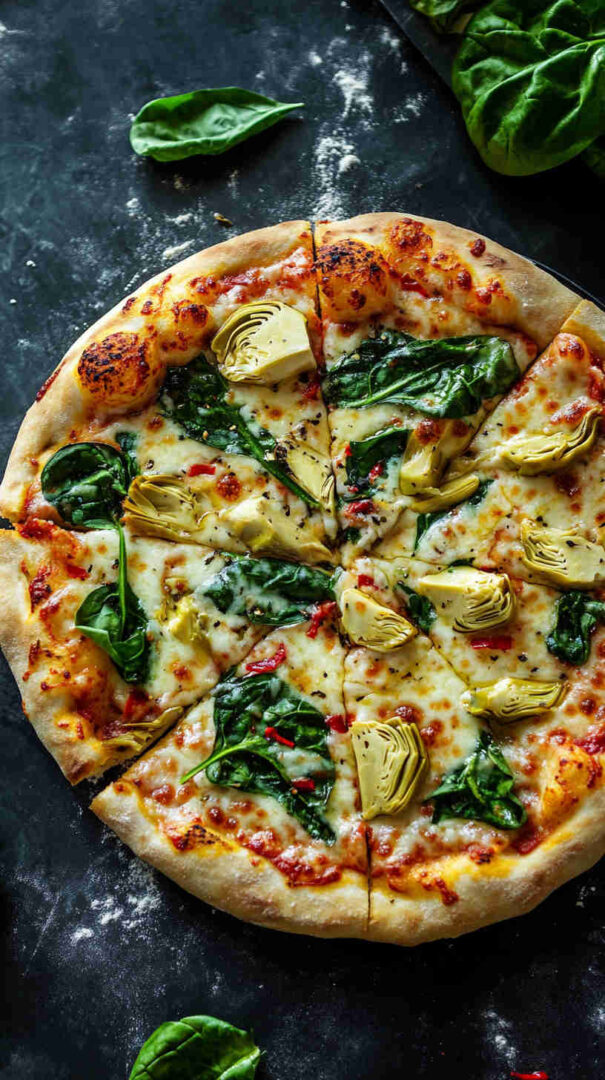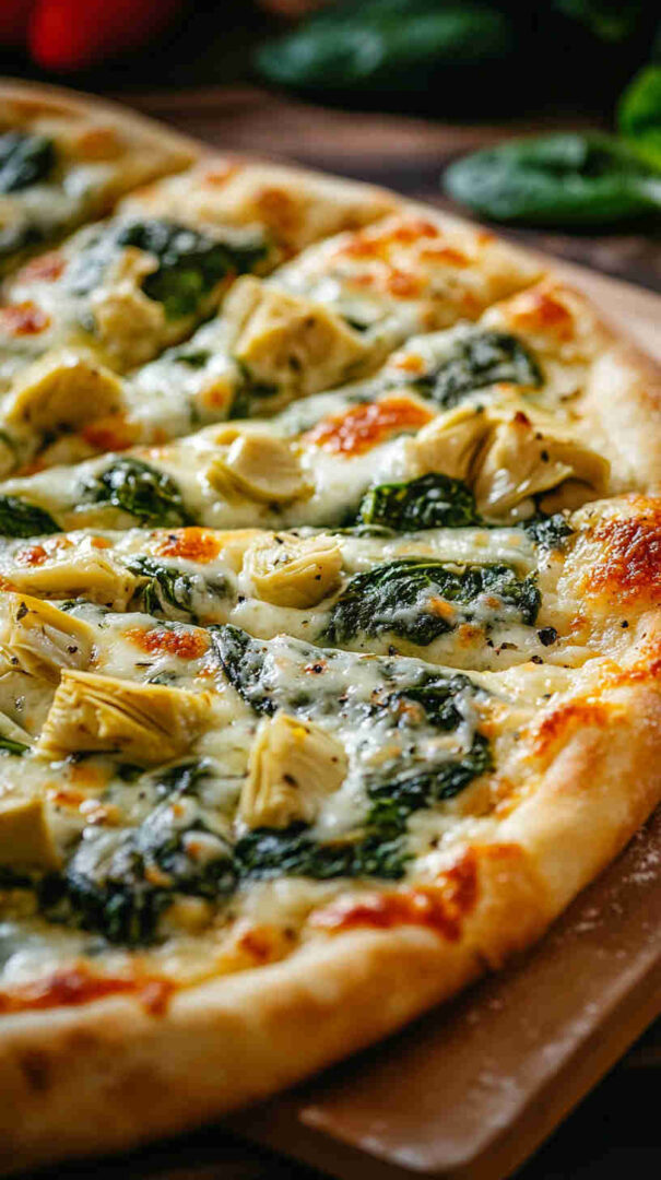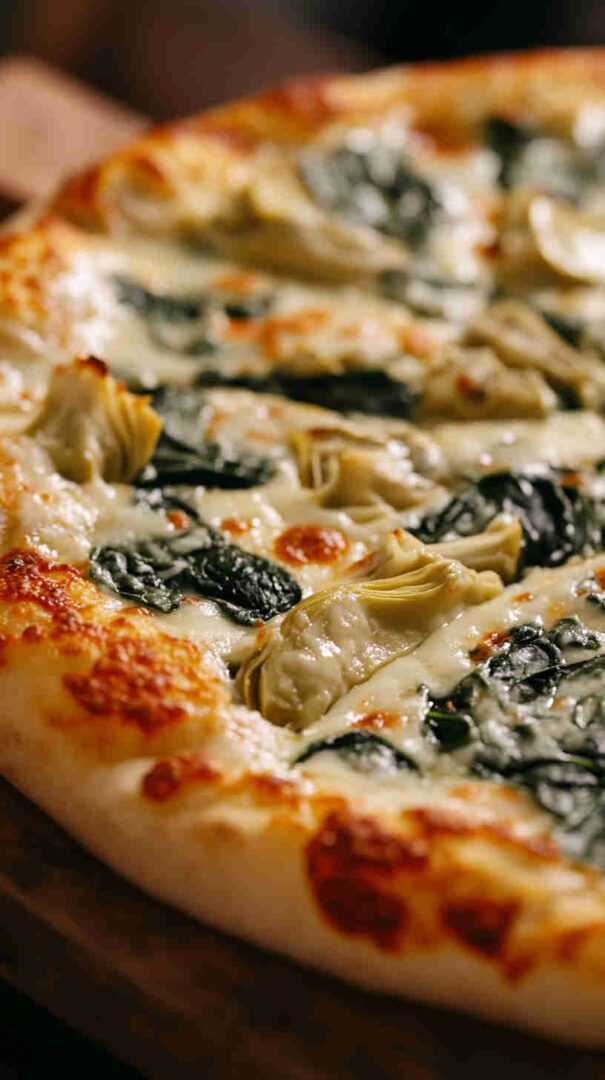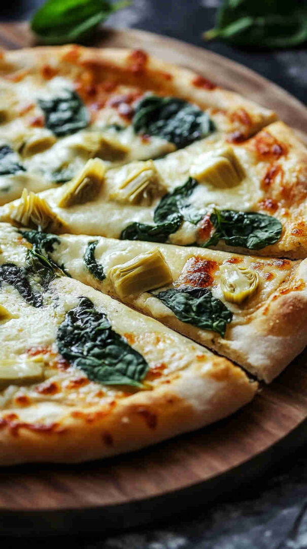 Creamy white pizza with spinach, artichokes, garlic, and three cheeses on crispy Italian crust—vegetarian bliss!