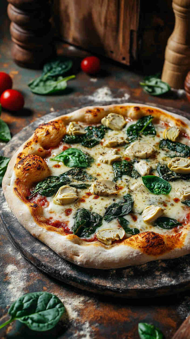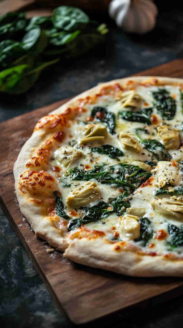 This Italian Spinach and Artichoke Pizza is a delicious white pizza (pizza bianca) inspired by Italian flavors, featuring a creamy garlic base topped with sautéed spinach, marinated artichoke hearts, and a generous blend of cheeses for a comforting, veggie-packed twist on classic Neapolitan-style flatbread.