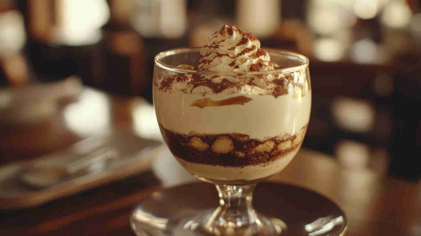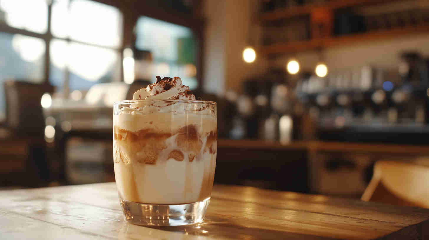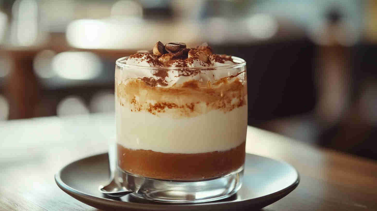 Creamy Italian tiramisu drink with espresso, mascarpone foam, cocoa, and Marsala—dessert in a glass.