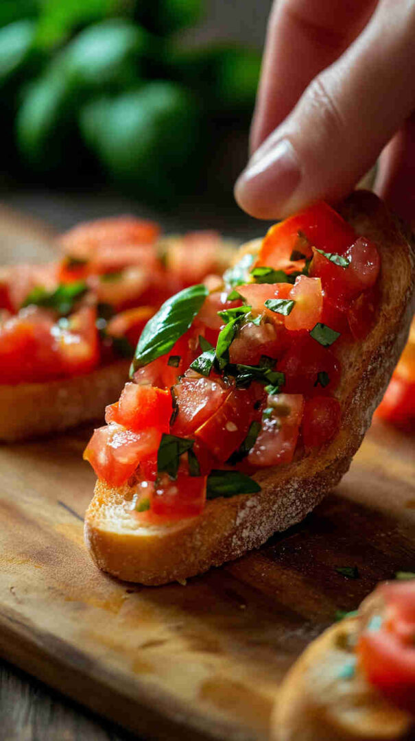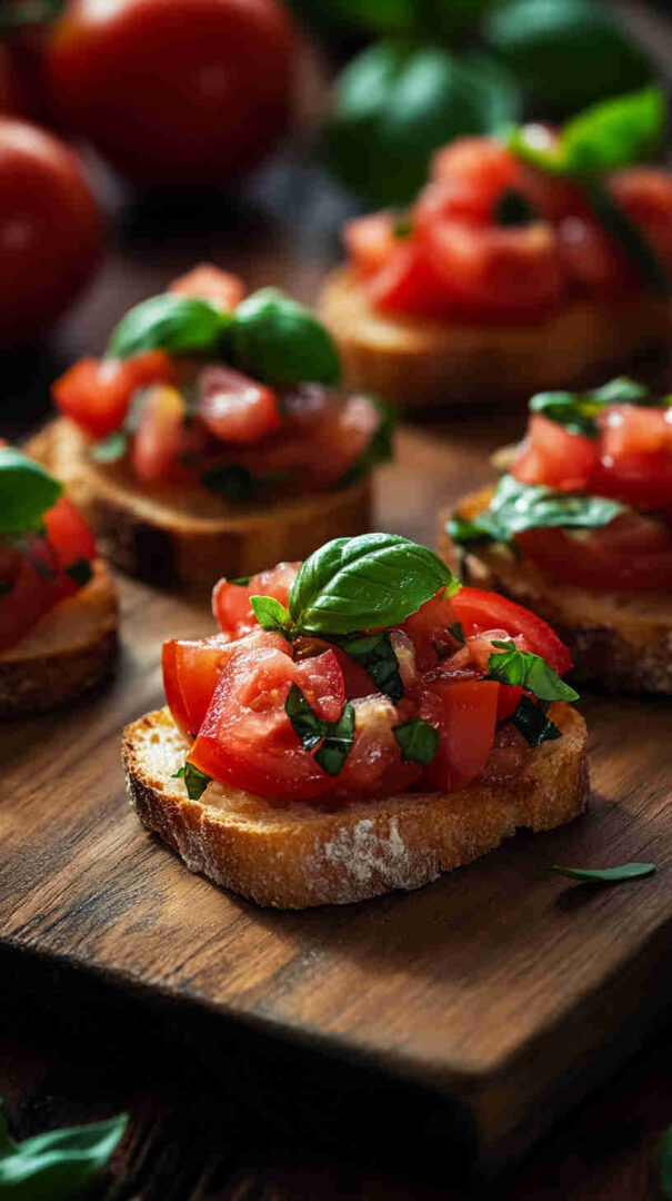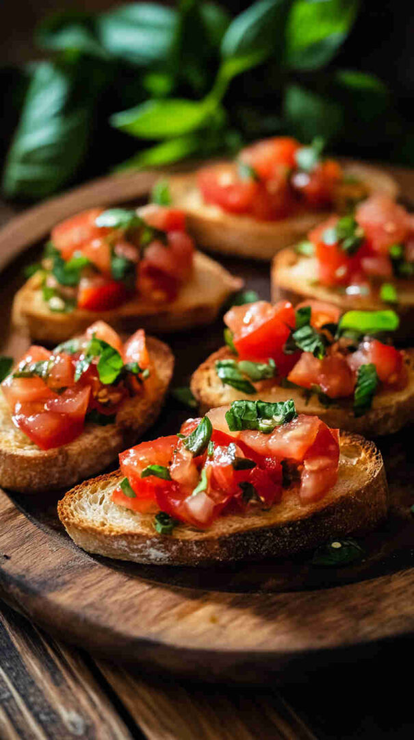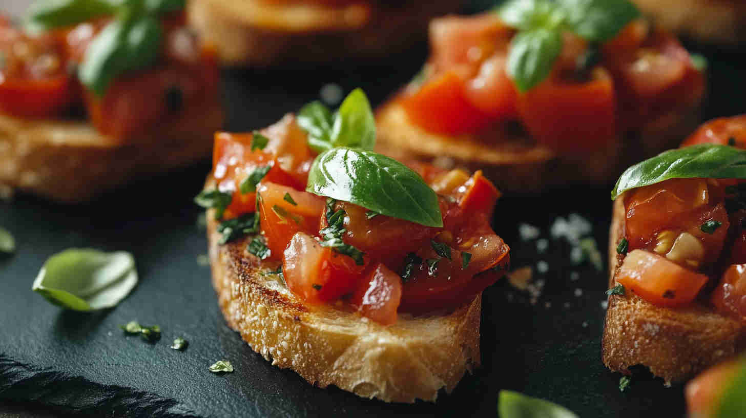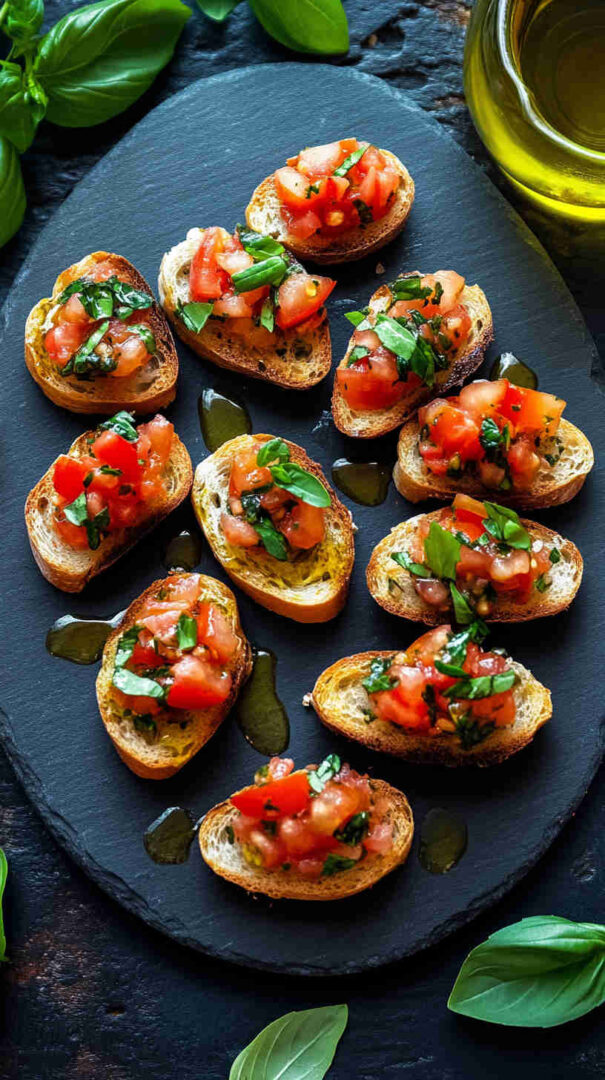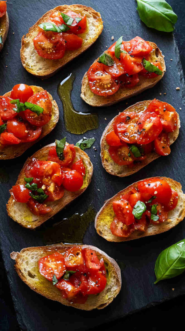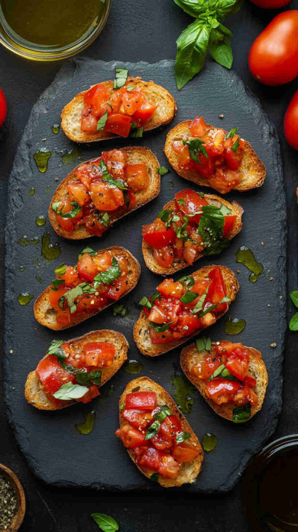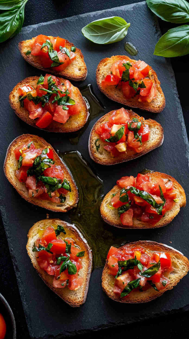 Fresh diced tomatoes, basil, and garlic on crispy garlic toasts — a bright, classic Italian appetizer ready in minutes.