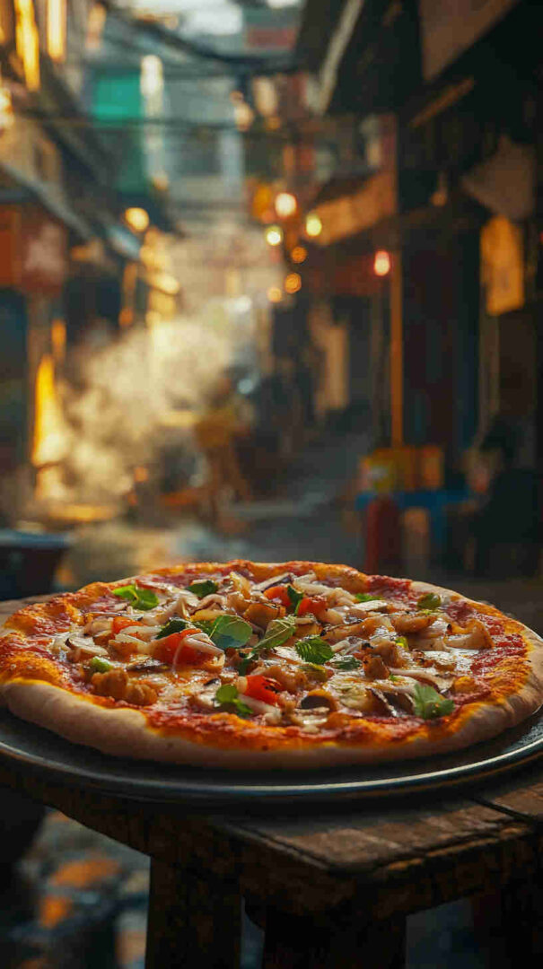 Crispy Italian pizza fused with tangy Vietnamese banh mi flavors: pork, pickles, herbs, cheese, and spicy drizzle.