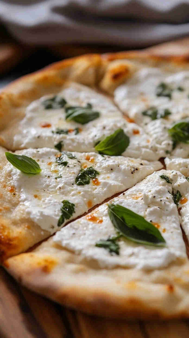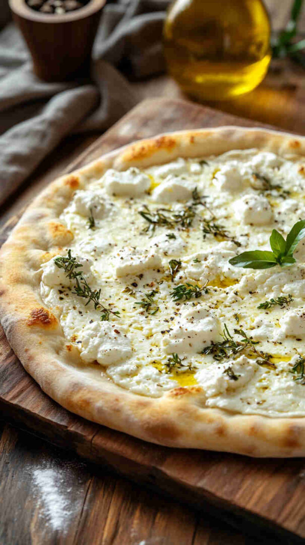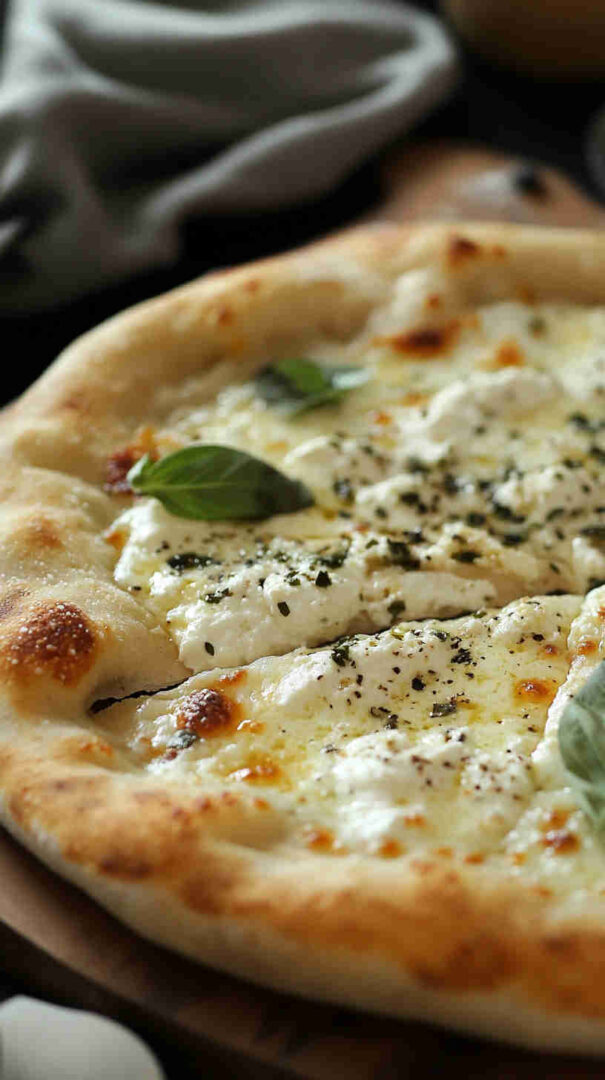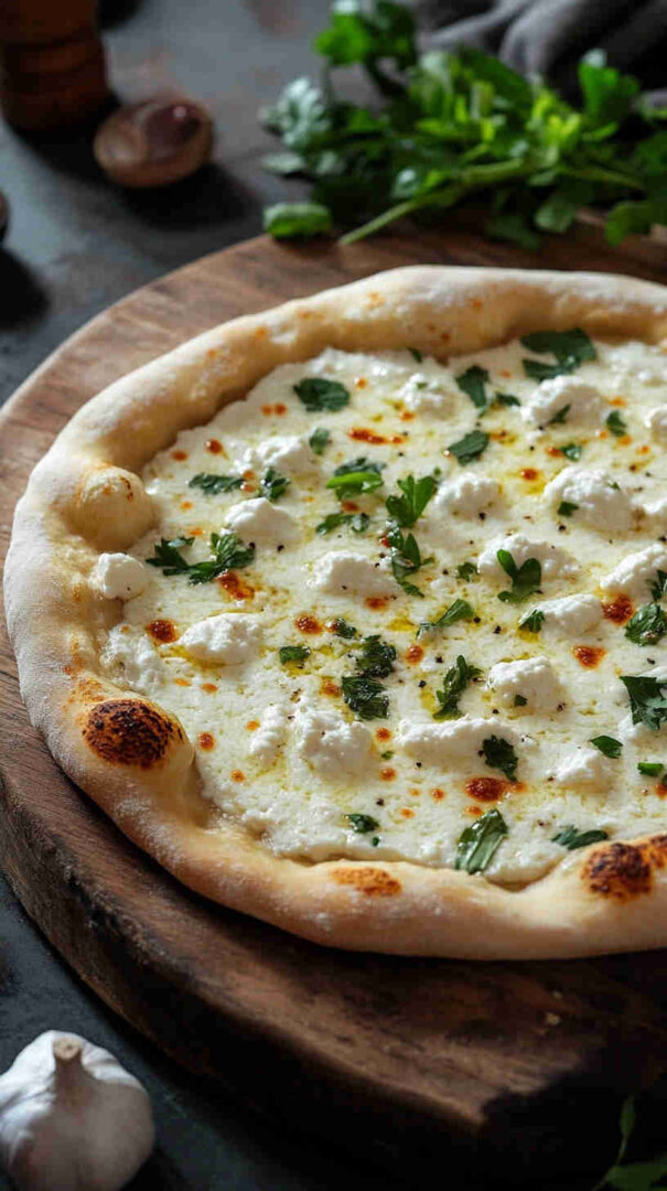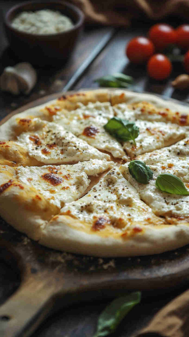 Creamy ricotta-based white pizza with garlic, mozzarella, and Parmesan on golden crust—cheesy Italian bliss without tomato sauce.