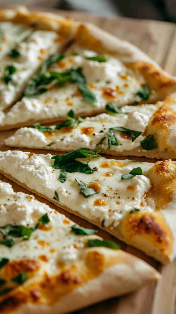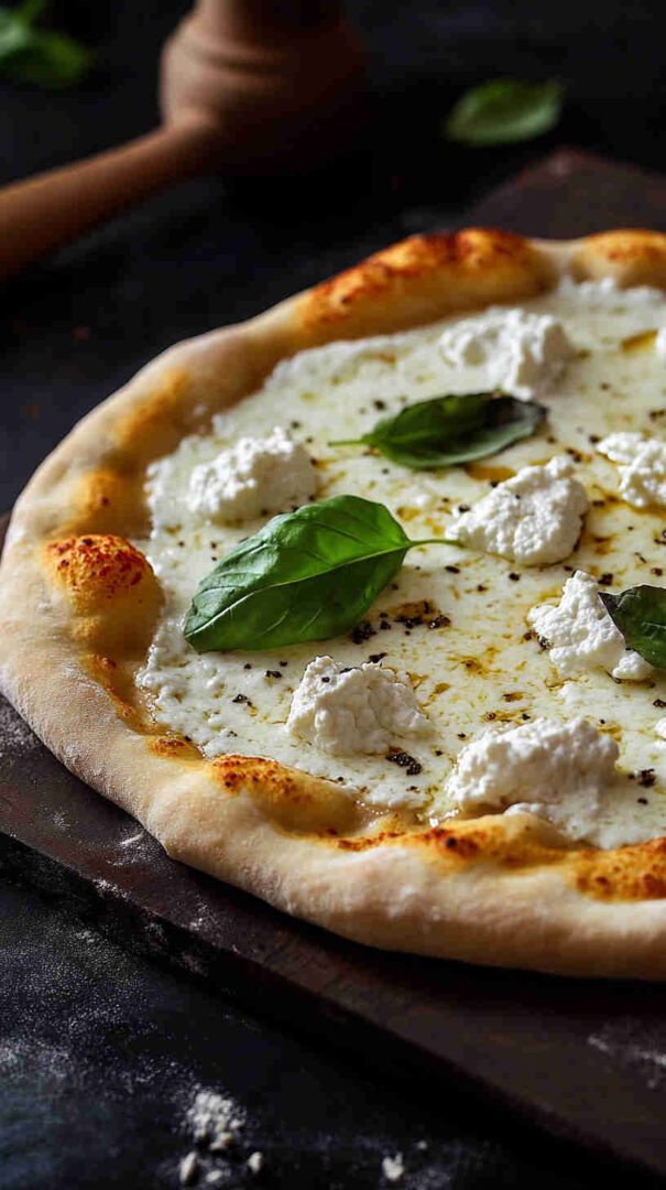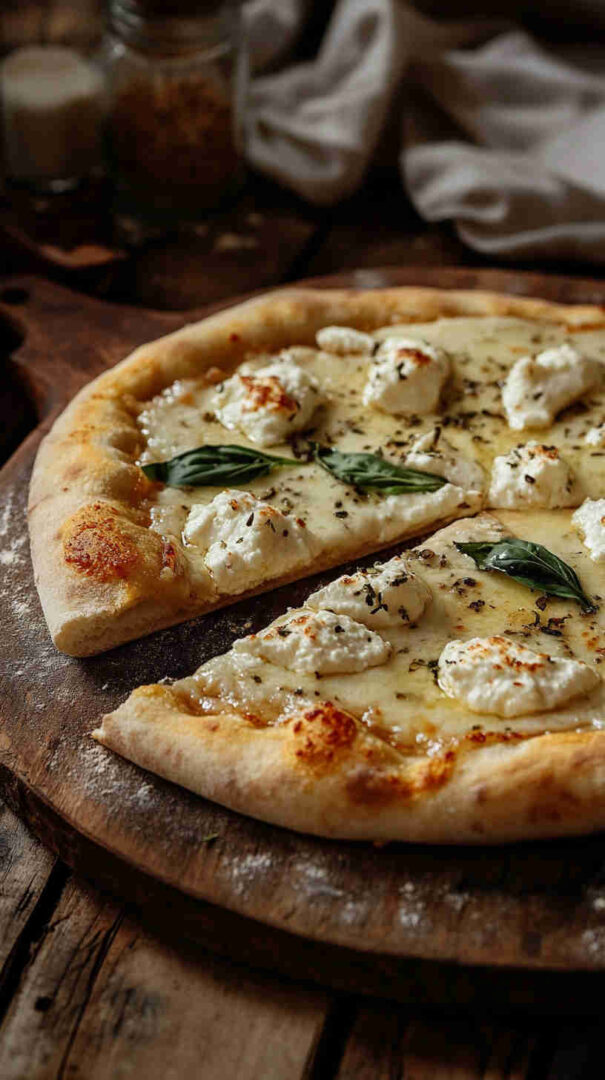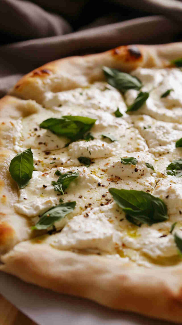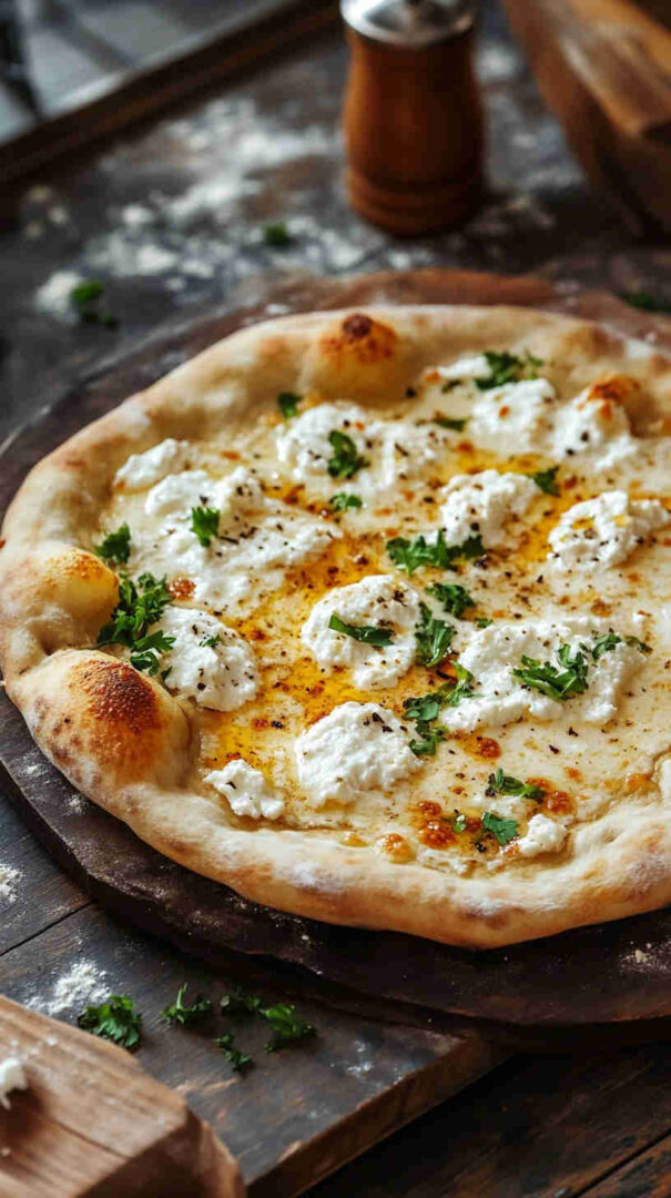 Creamy ricotta-based white pizza with garlic, mozzarella, and Parmesan on golden crust—cheesy Italian bliss without tomato sauce.