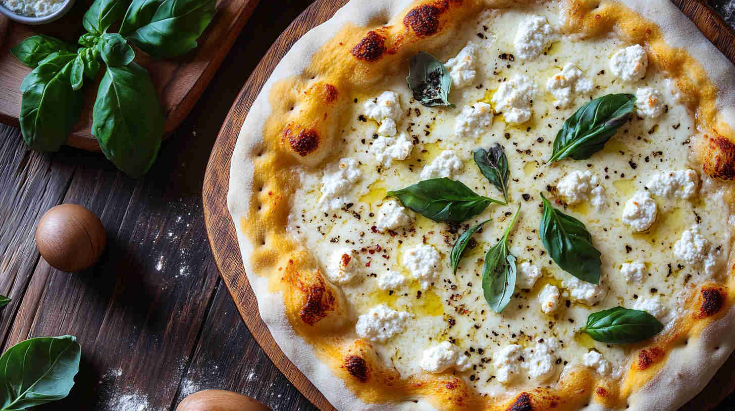 Creamy ricotta-based white pizza with garlic, mozzarella, and Parmesan on golden crust—cheesy Italian bliss without tomato sauce.