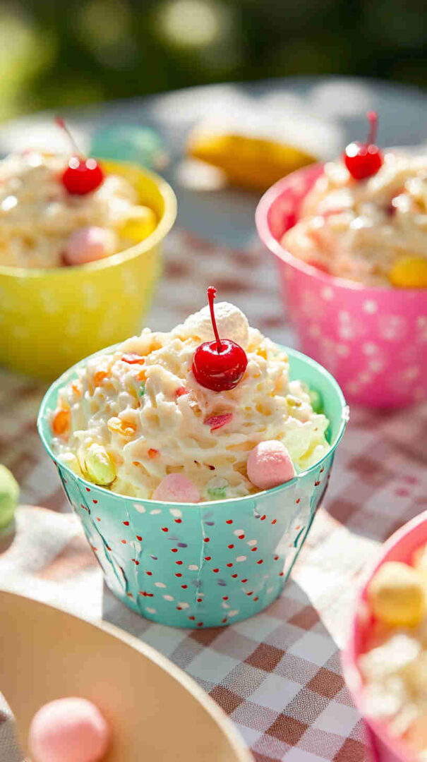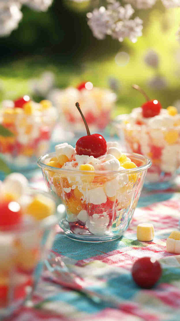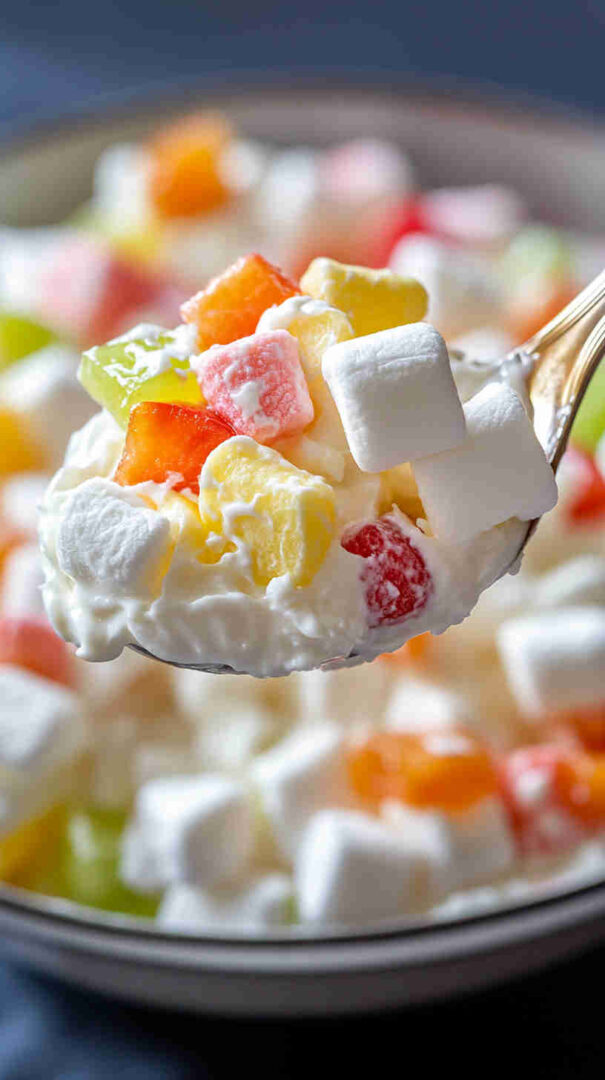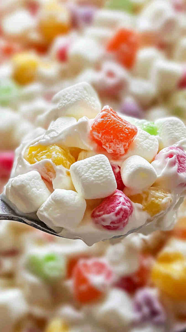 Colorful, fluffy marshmallow ambrosia surprise with rainbow marshmallows, fruit, cherries, coconut – sweet, fun, kid-approved delight!