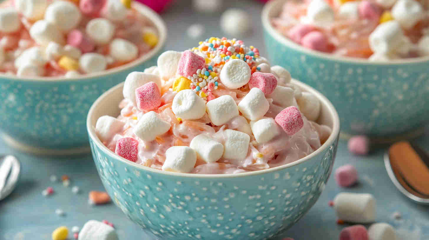 Kid-Friendly Marshmallow Ambrosia Surprise is pure fun in a bowl – extra fluffy Cool Whip loaded with colorful rainbow mini marshmallows, juicy mandarin oranges, sweet pineapple, bright maraschino cherries, and chewy coconut, plus a hidden “surprise” of colorful candy bits or sprinkles.