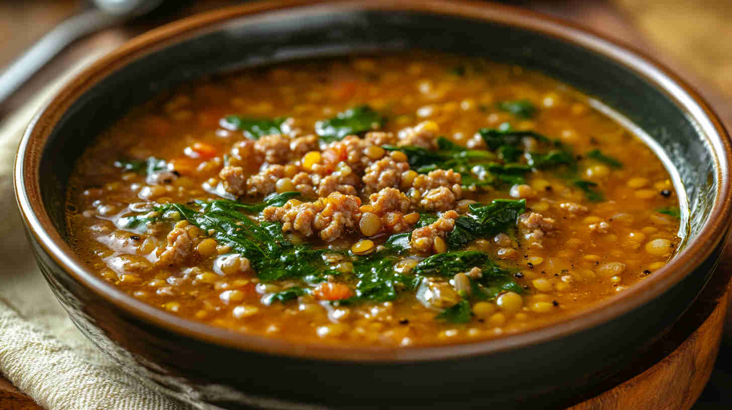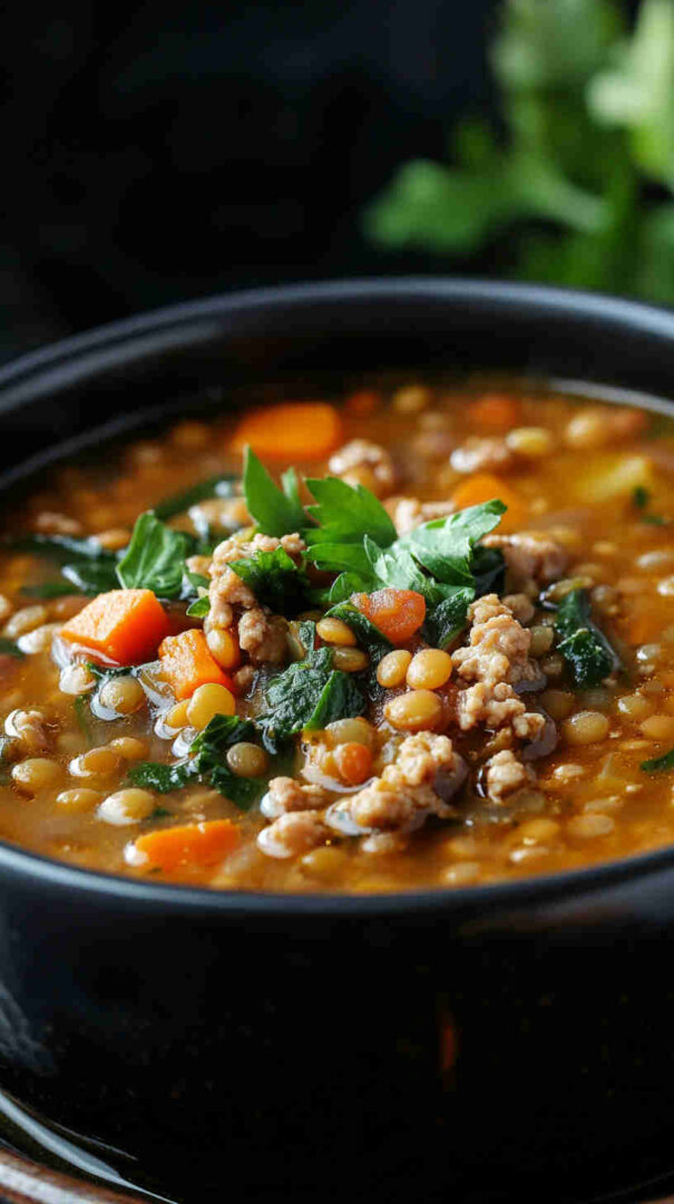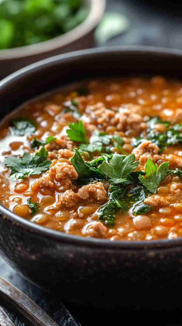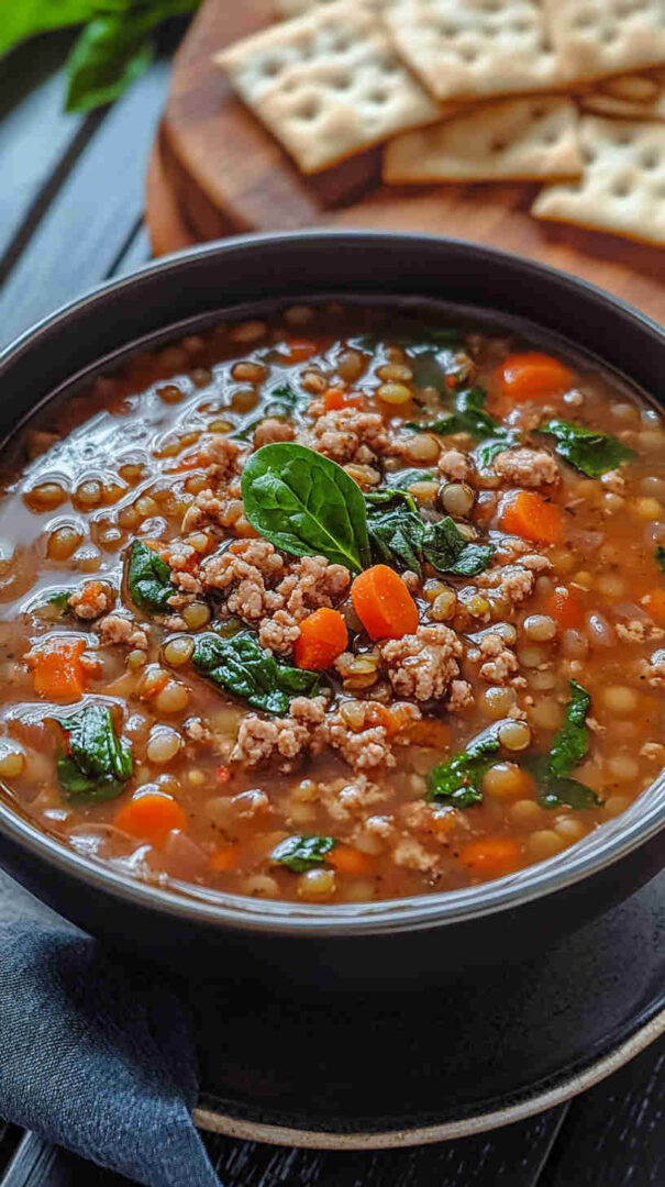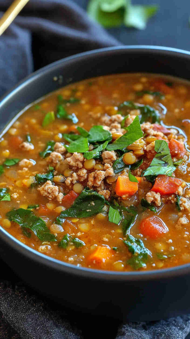 This hearty Lentil Soup with Ground Turkey and Spinach combines protein-rich lentils, lean ground turkey, and fresh spinach in a flavorful broth.