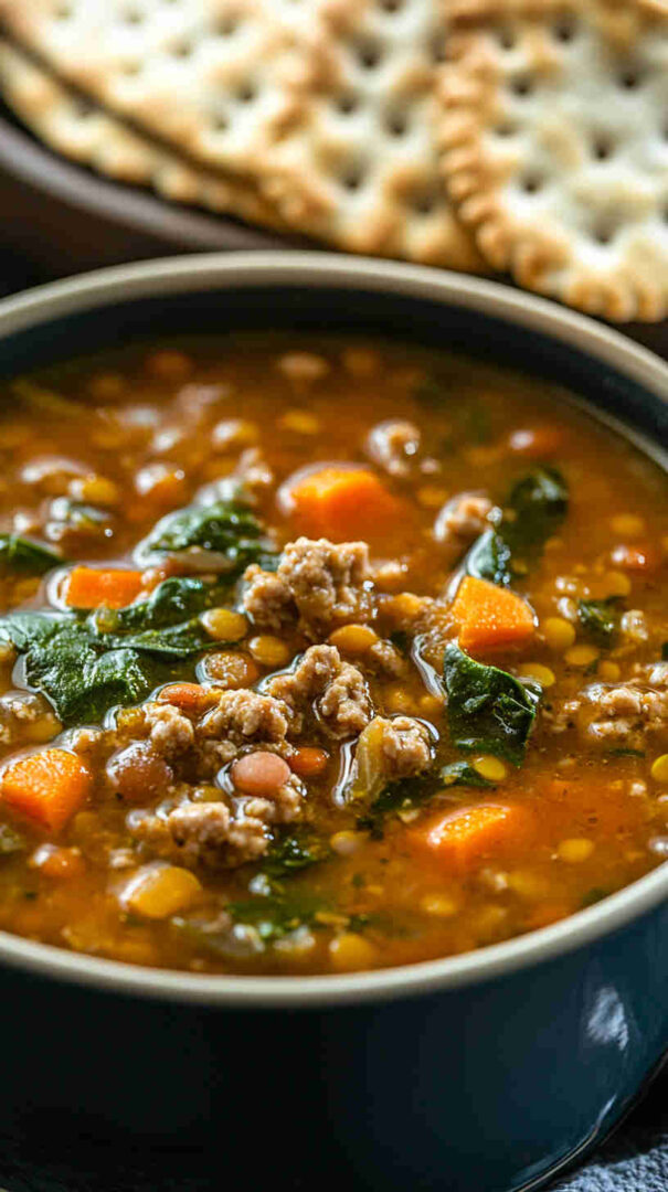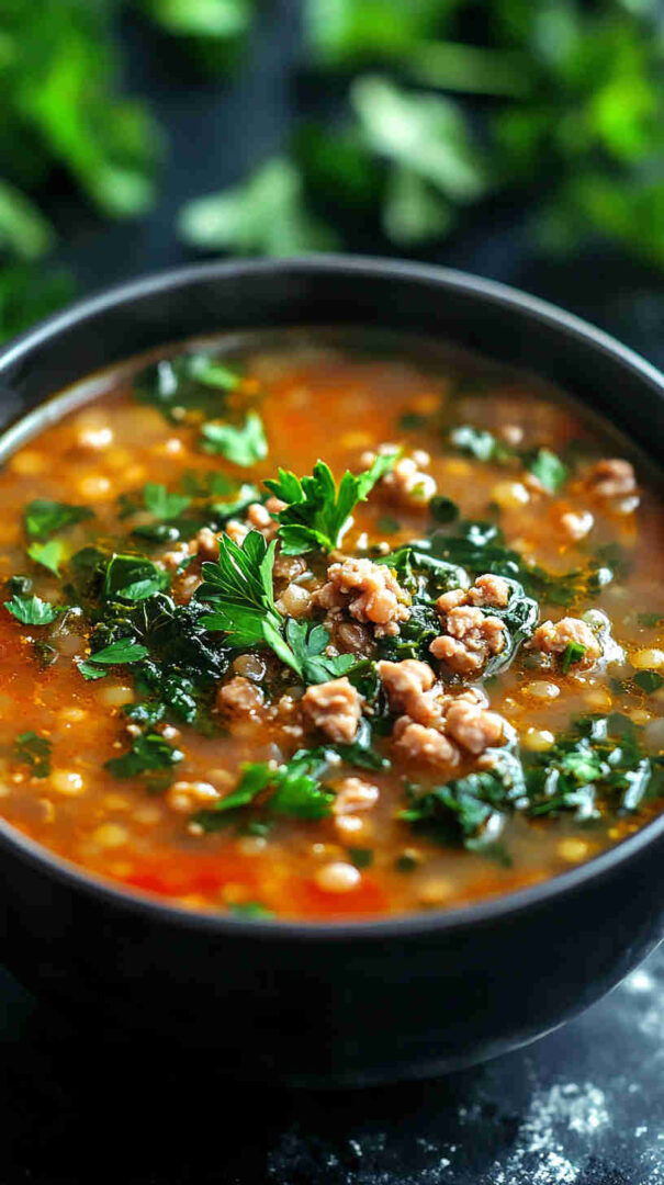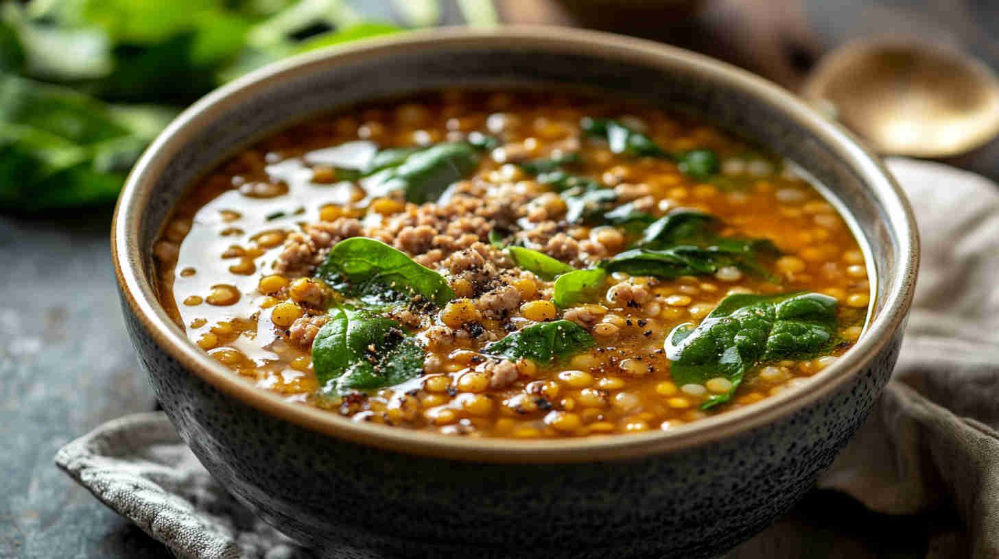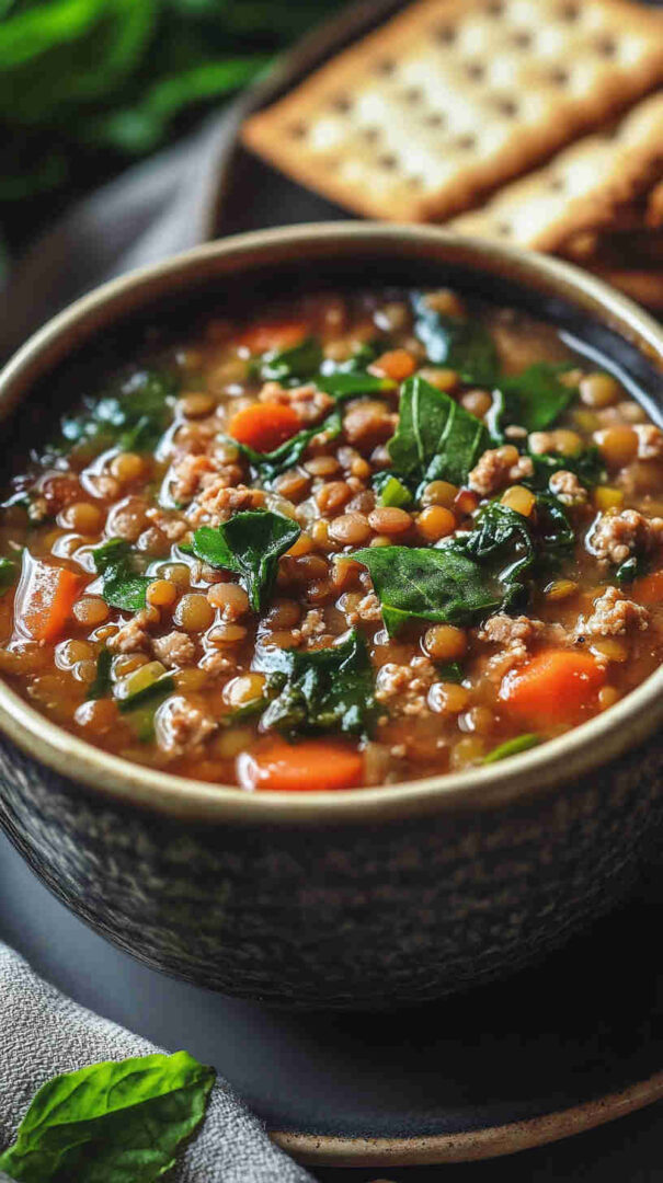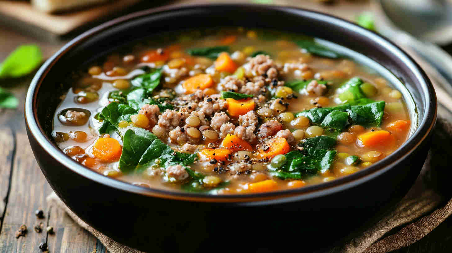 This hearty Lentil Soup with Ground Turkey and Spinach combines protein-rich lentils, lean ground turkey, and fresh spinach in a flavorful broth.