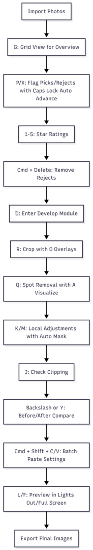 We’ll explore navigation and viewing shortcuts first, as they form the foundation of moving efficiently within Lightroom. Then, we’ll dive into culling and organizing tools, editing essentials, local adjustments, batch processing, and advanced tricks. Along the way, we’ll include a summary table for quick reference and a workflow diagram to visualize how these shortcuts interconnect in a real editing session.