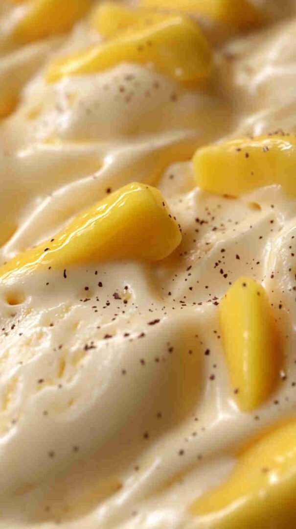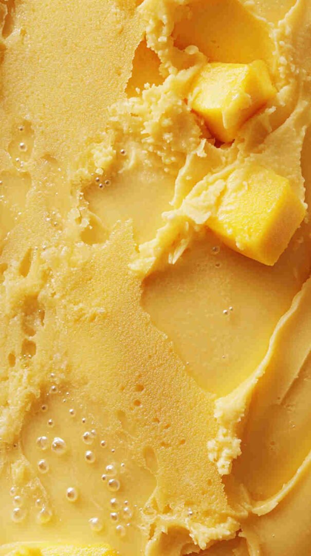- Transfer to your freezer container — Scoop the beautiful golden mixture into a shallow, airtight container. Smooth the top with a spatula for even freezing (pro tip: press plastic wrap right onto the surface to stop ice crystals from forming).