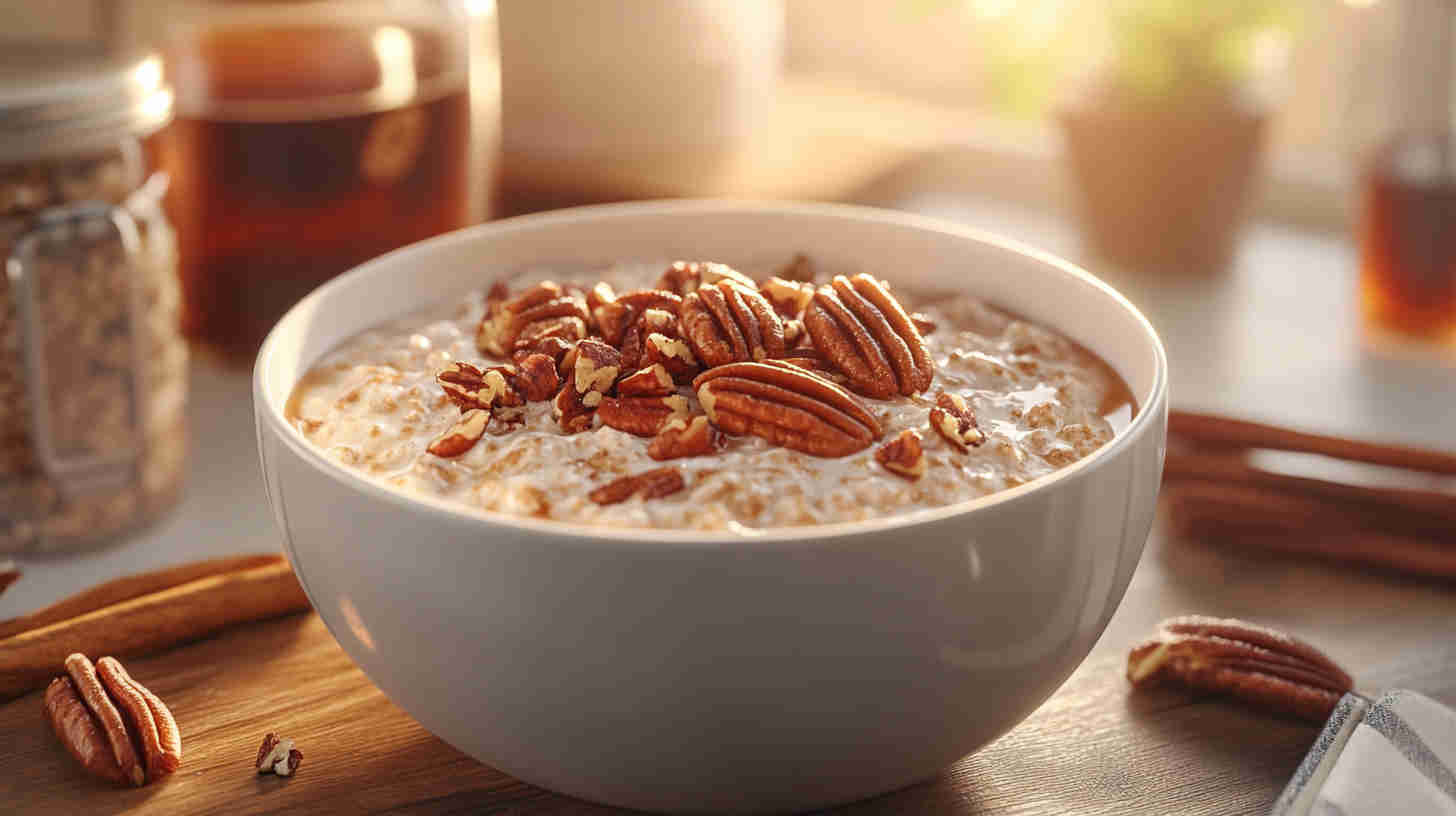The oats become velvety and creamy, the maple syrup infuses deep, authentic sweetness, cinnamon adds that classic bakery warmth, and toasted pecans bring irresistible crunch and buttery richness in every bite. It’s high in fiber, protein (especially with Greek yogurt), and healthy fats, keeping you satisfied for hours.