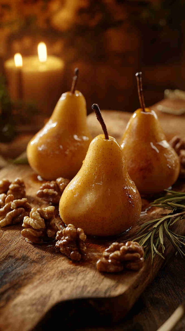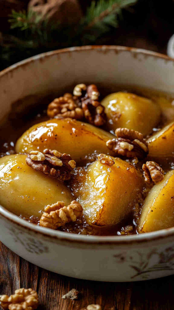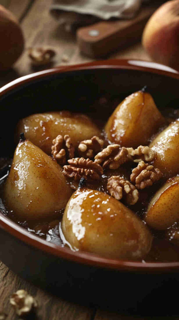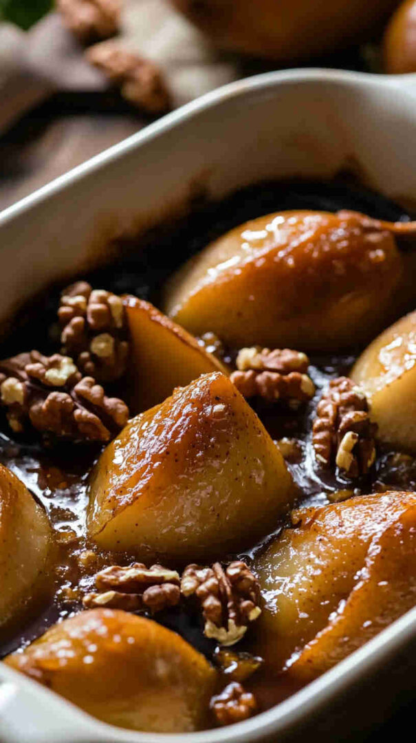 Tender roasted pears drizzled with maple syrup, topped with crunchy walnuts and cinnamon—a healthy, naturally sweet fall dessert.