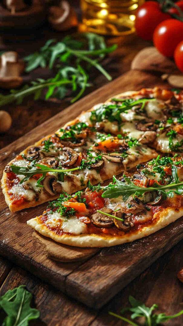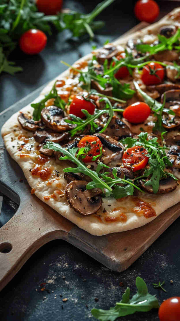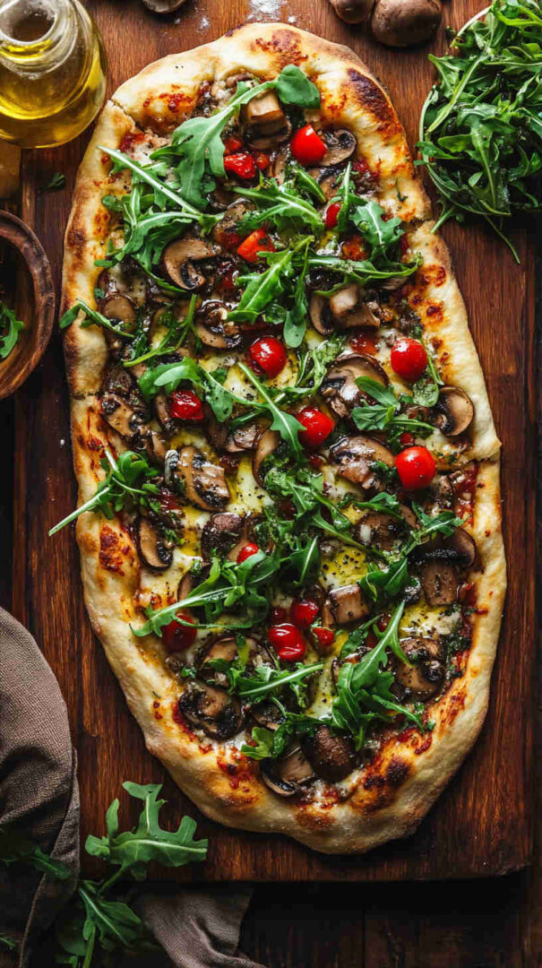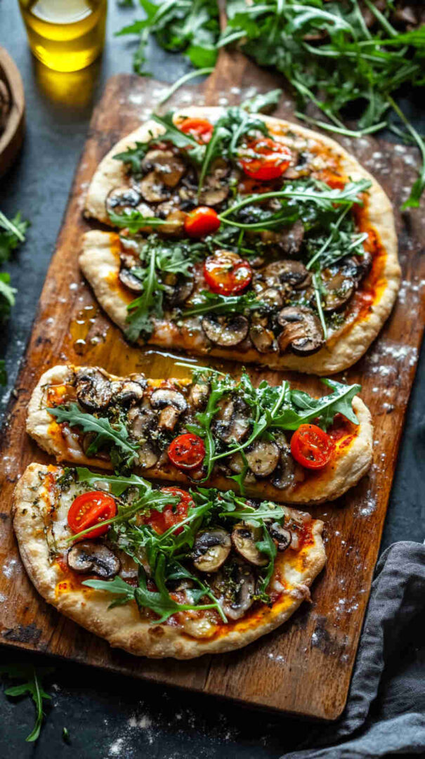Mushroom and Arugula Flatbread Pizza layers golden sautéed mushrooms and melty mozzarella on crisp flatbread or naan, finished with a generous handful of fresh arugula, tangy balsamic drizzle, and shaved parmesan. It’s a fresh, elegant vegetarian dish with contrasting textures—crispy base, savory mushrooms, and bright, peppery greens—for effortless elegance.