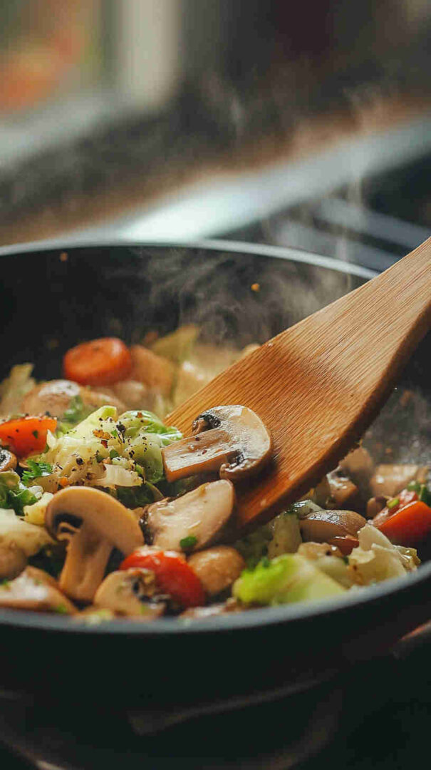 - Cabbage — Green or white cabbage works best for crunch and affordability; it’s naturally sweet when lightly cooked and pairs beautifully with mushrooms. Use about half a medium head for easy portions.