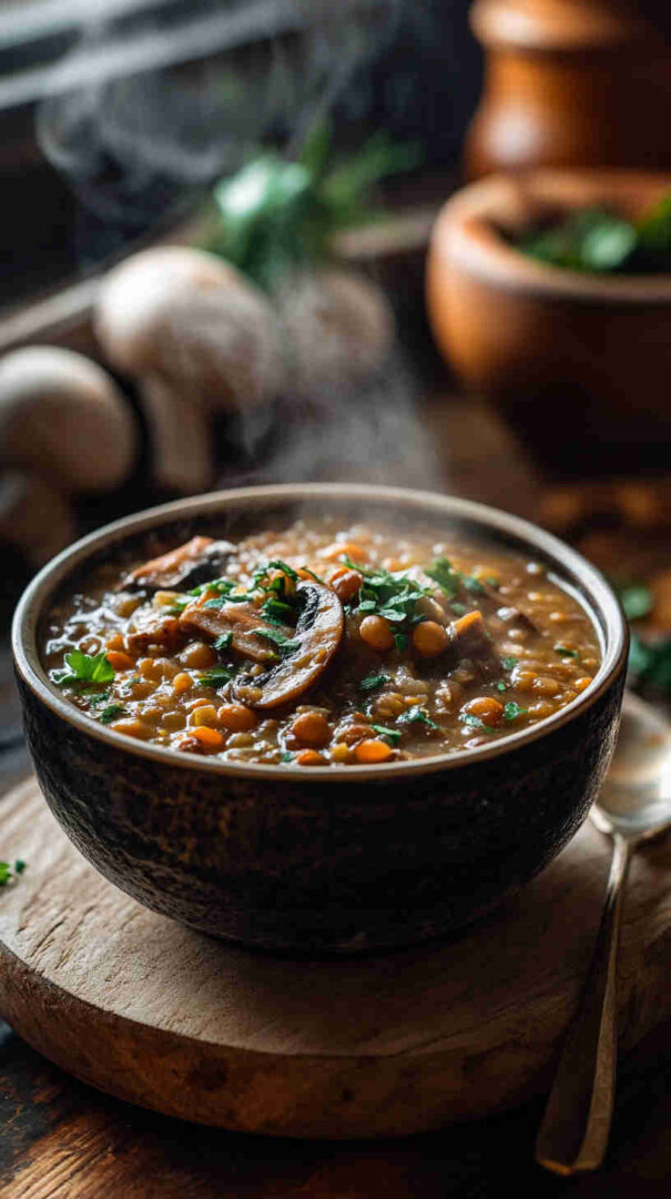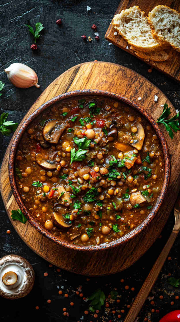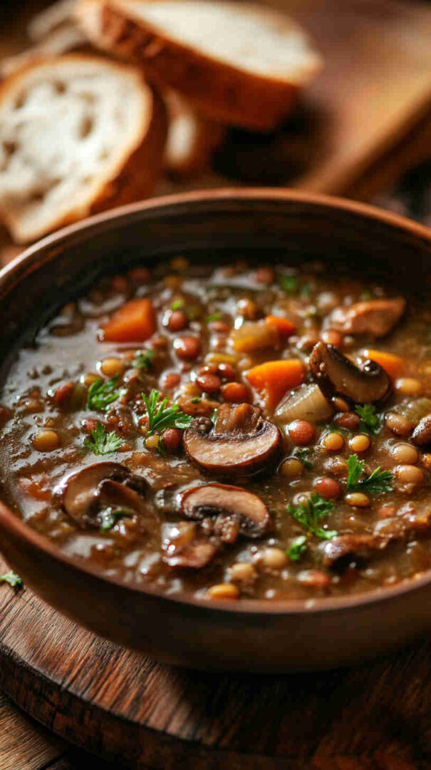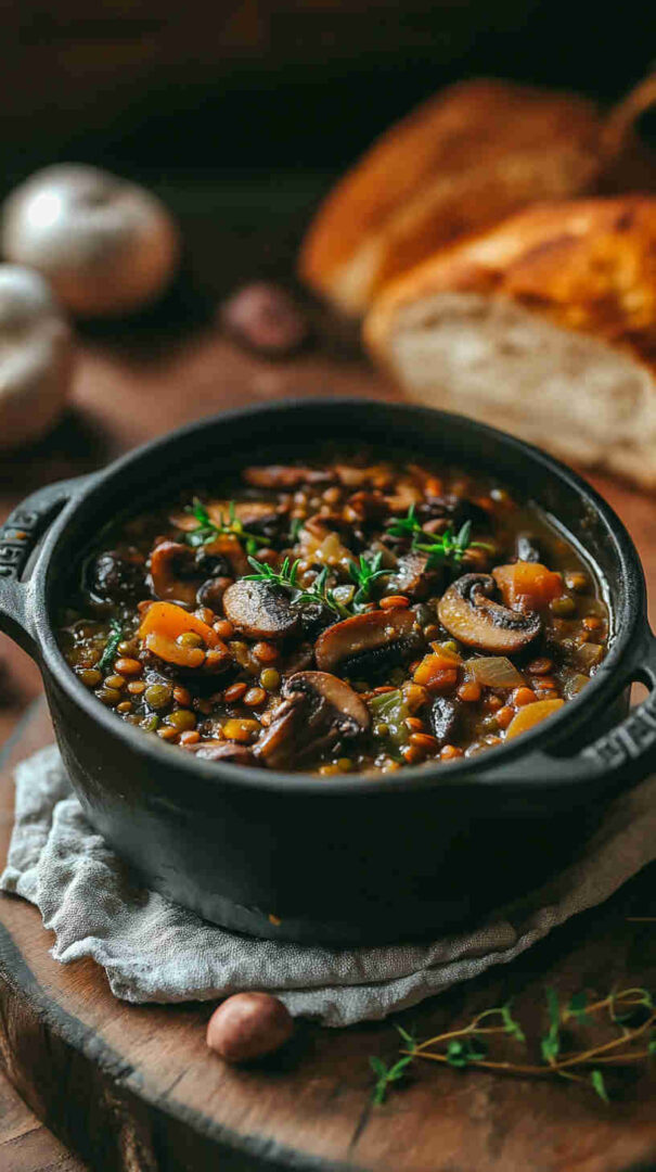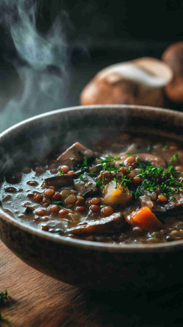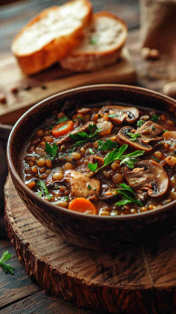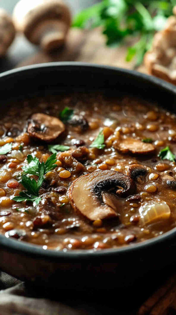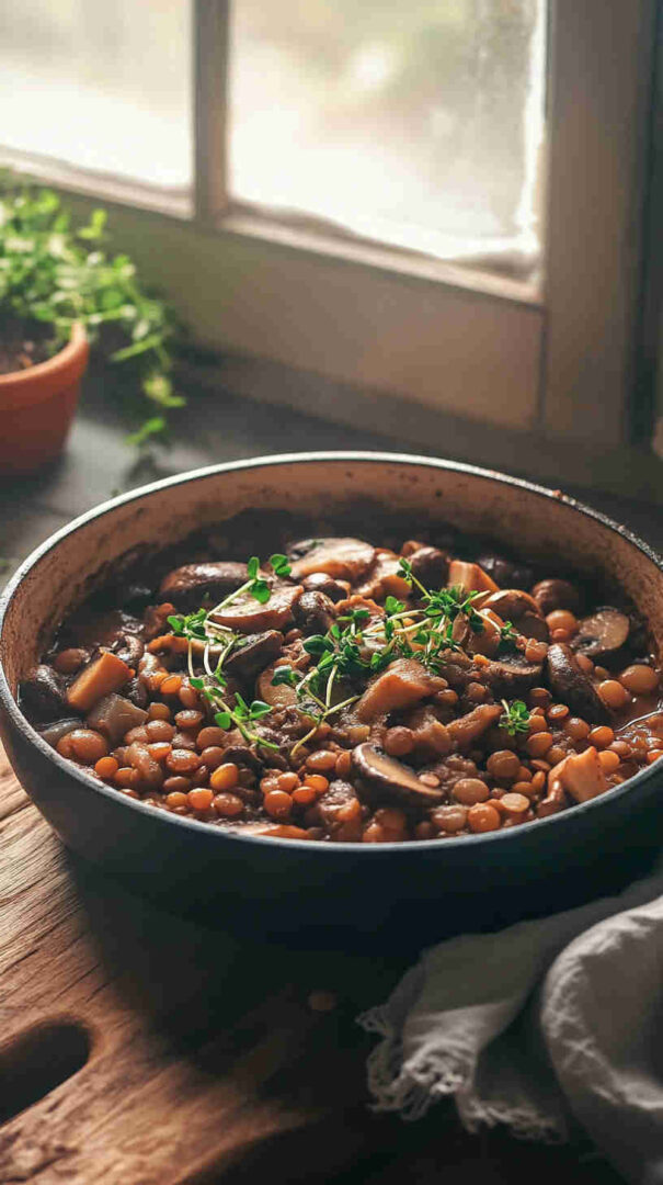 Hearty, cheap vegan stew with earthy mushrooms, tender lentils, and cozy flavors.