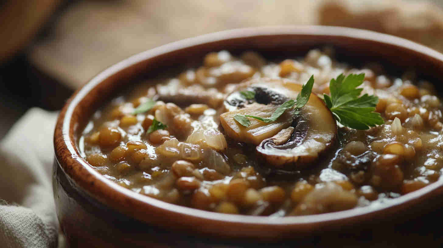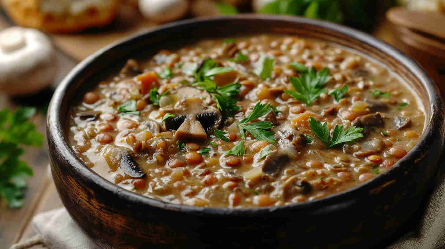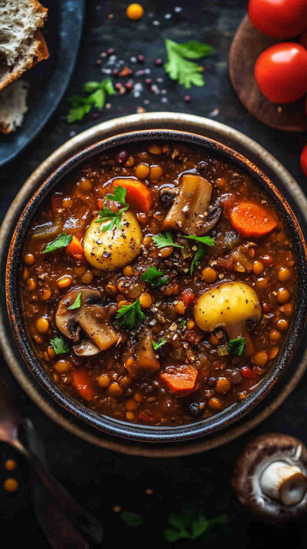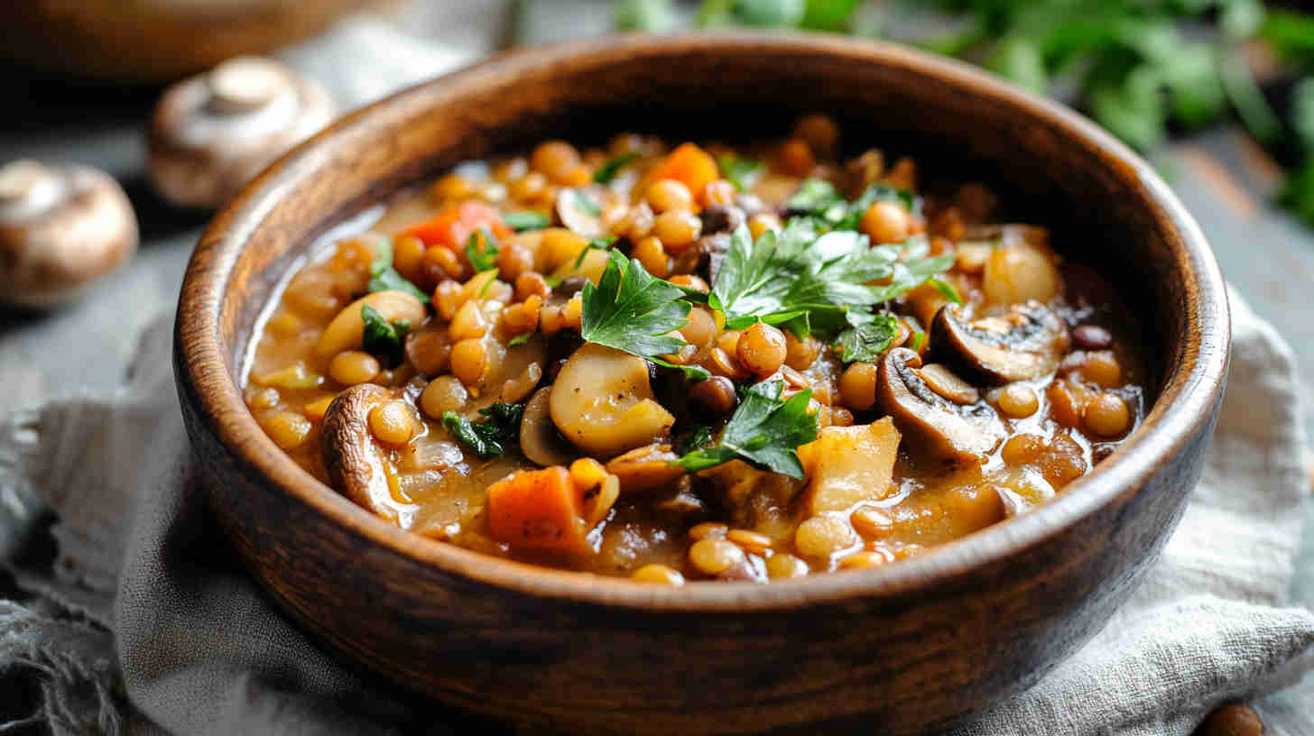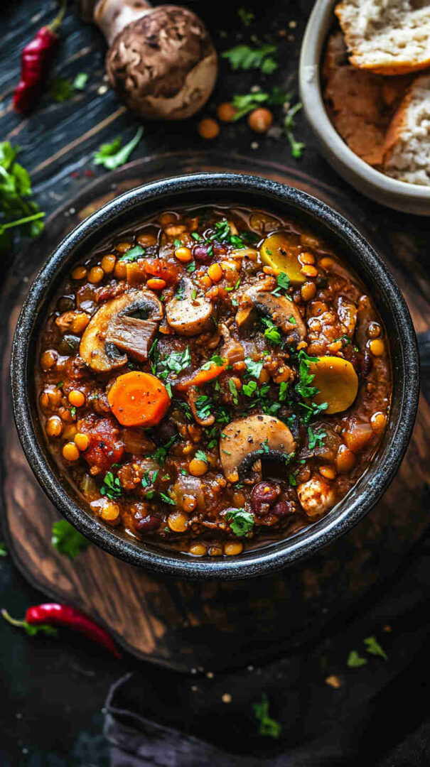Hearty, cheap vegan stew with earthy mushrooms, tender lentils, and cozy flavors.