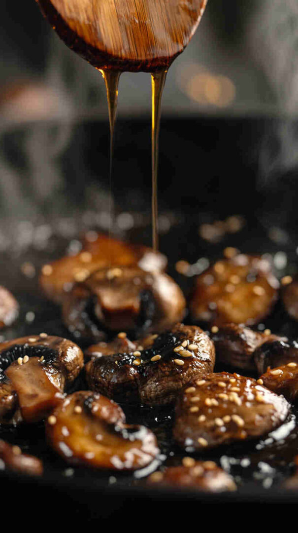 - Build the glaze — Pour in soy sauce, honey/sugar, and rice vinegar (if using). Stir well to coat mushrooms evenly.