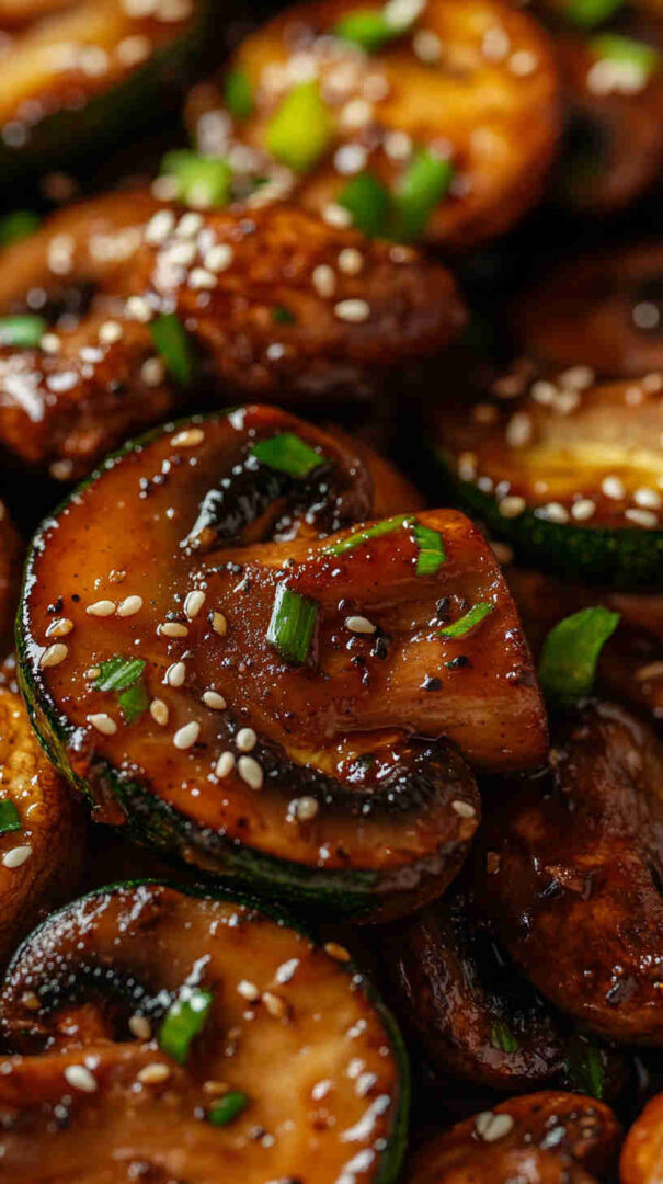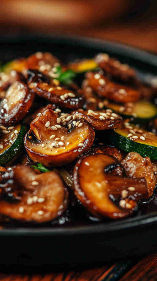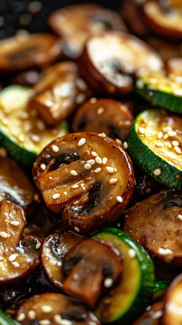 Golden mushrooms and crisp zucchini in light garlic-soy-sesame sauce—quick, fresh vegan stir-fry.