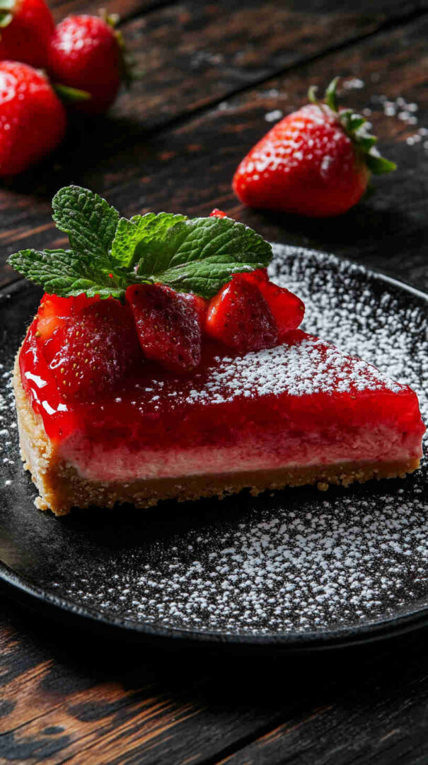The fresh strawberry topping bursts with natural fruit flavor and vibrant color, making every bite feel indulgent yet refreshing. Best of all, it comes together quickly with pantry staples, requires no baking skills, and looks stunning on the table—perfect for impressing guests or treating yourself without the guilt. It’s make-ahead friendly, slices beautifully, and tastes even better after chilling overnight.