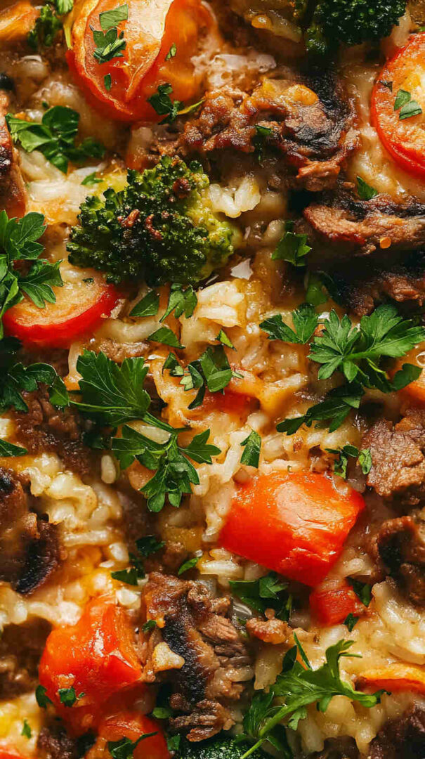The rice absorbs all those savory beefy flavors and broth, turning tender and flavorful without constant stirring. It’s creamy from the soup base, cheesy on top with that irresistible golden melt, and packed with protein and veggies for a complete, balanced dinner.