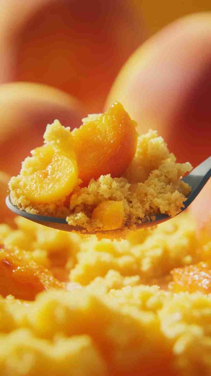 - No stirring is the magic trick – the butter and peach juice create steam that cooks the cake mix into crust and cake.