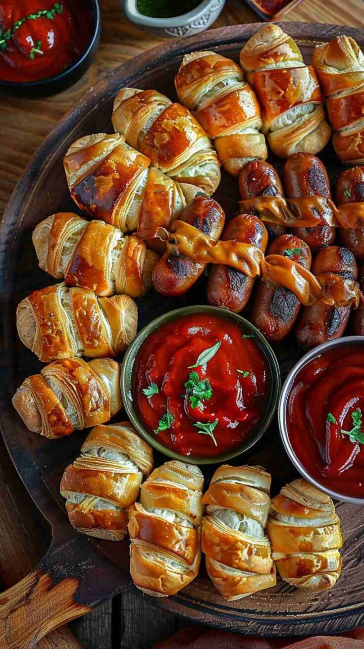 Mini hot dogs wrapped in buttery, flaky crescent dough, baked until golden and served with an array of dipping sauces. The ultimate 3-ingredient, crowd-devouring party classic that disappears in seconds.