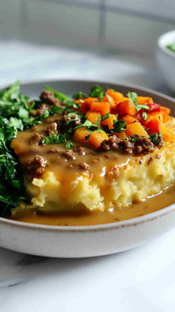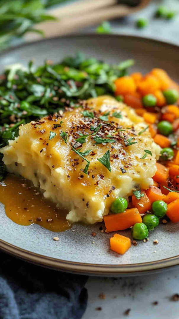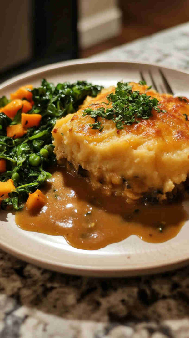 This Protein-Packed Vegan Shepherd’s Pie features a rich, savory base of lentils, mushrooms, carrots, peas, and aromatic herbs simmered in a deep tomato-vegetable gravy, crowned with creamy mashed potatoes flecked with nutritional yeast. High in plant protein and fiber, it’s a hearty, comforting classic reimagined—perfect for cozy dinners or meal prep.