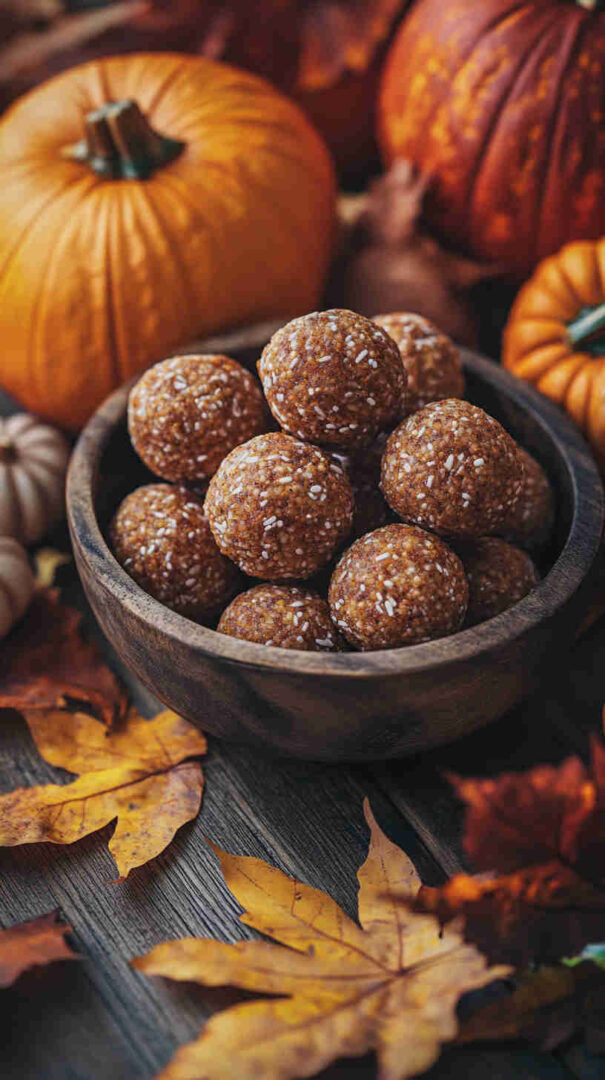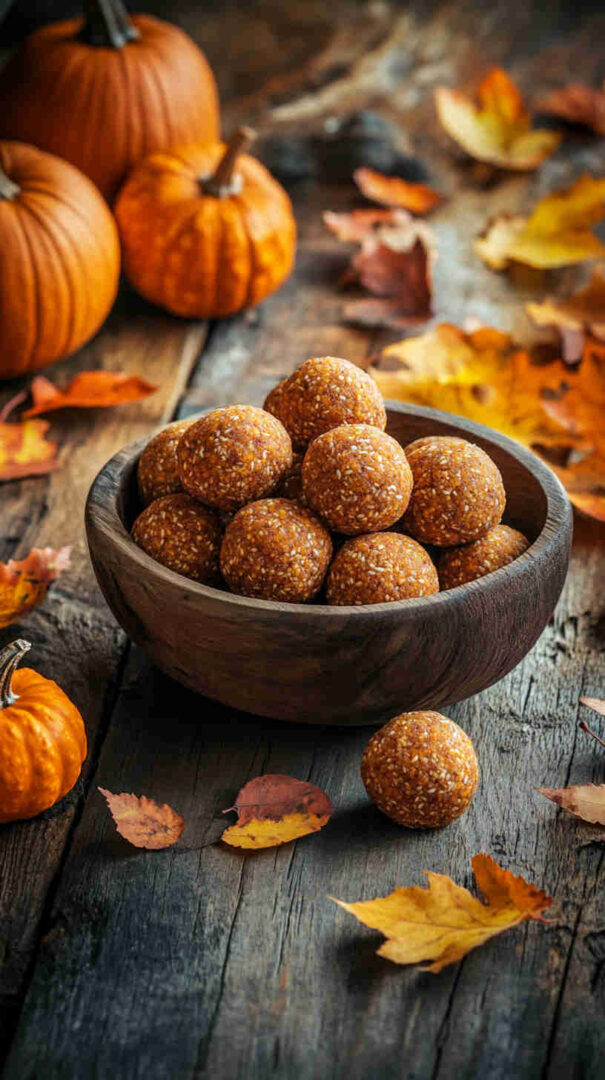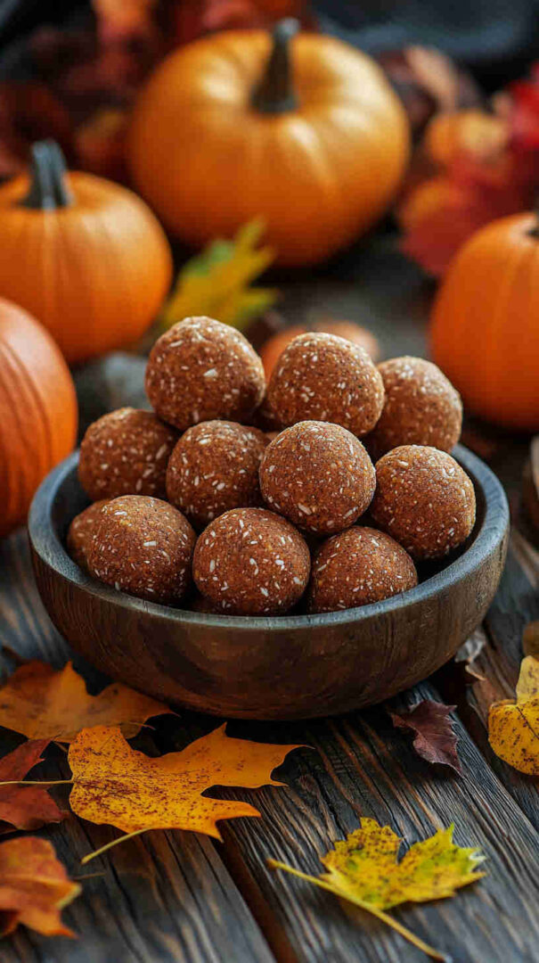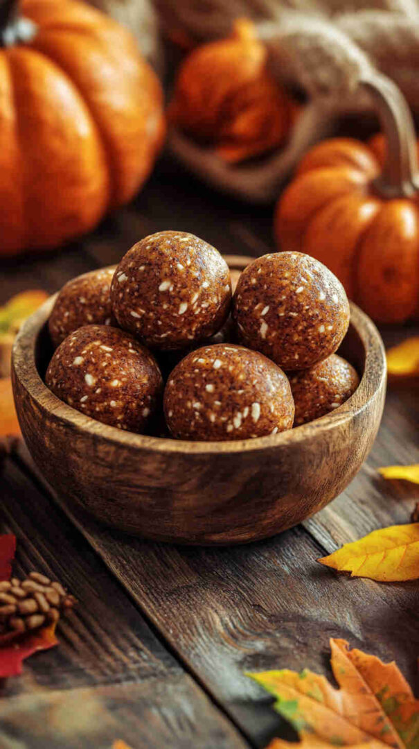 Creamy nut butter (almond or peanut) acts as the binder and delivers healthy fats — natural versions without added sugar or oil are best. Canned pumpkin puree brings authentic fall flavor, moisture, and vitamins without making the balls soggy.