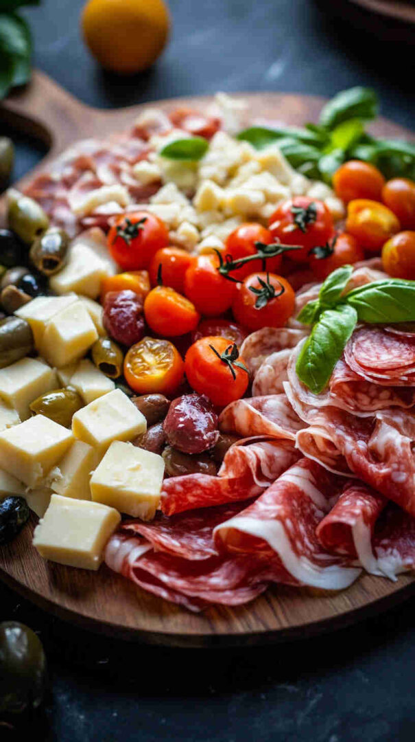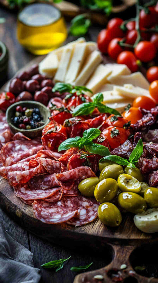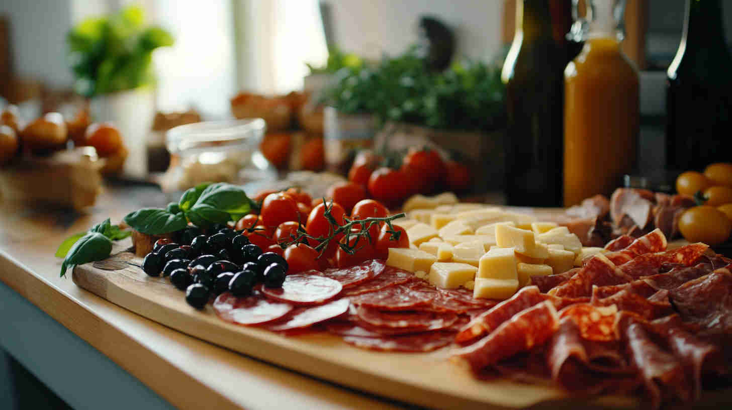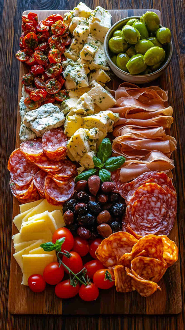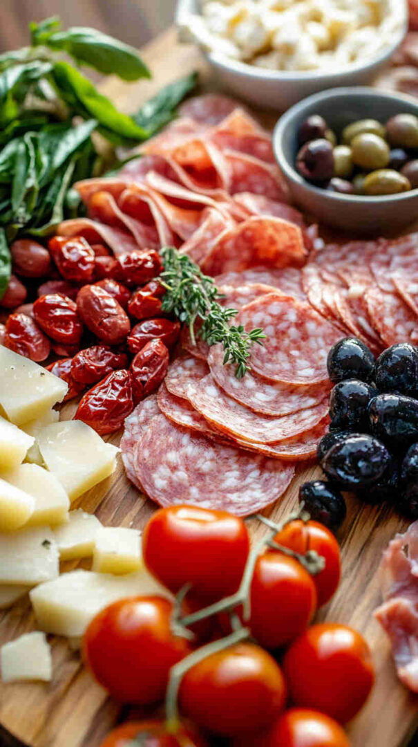 Start with high-quality Italian imports when possible — authentic Prosciutto di Parma (silky, not too salty), fresh fior di latte mozzarella (creamy and mild), and good jarred olives (Castelvetrano for bright green buttery flavor, Kalamata for deep richness).