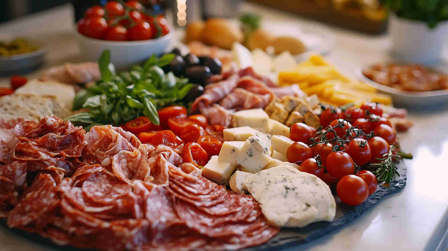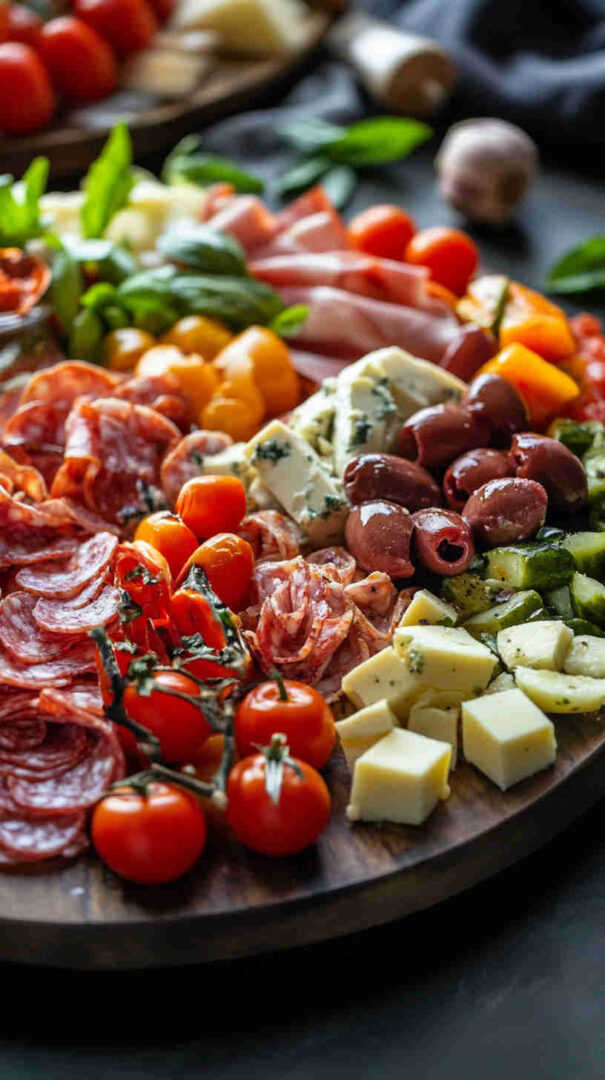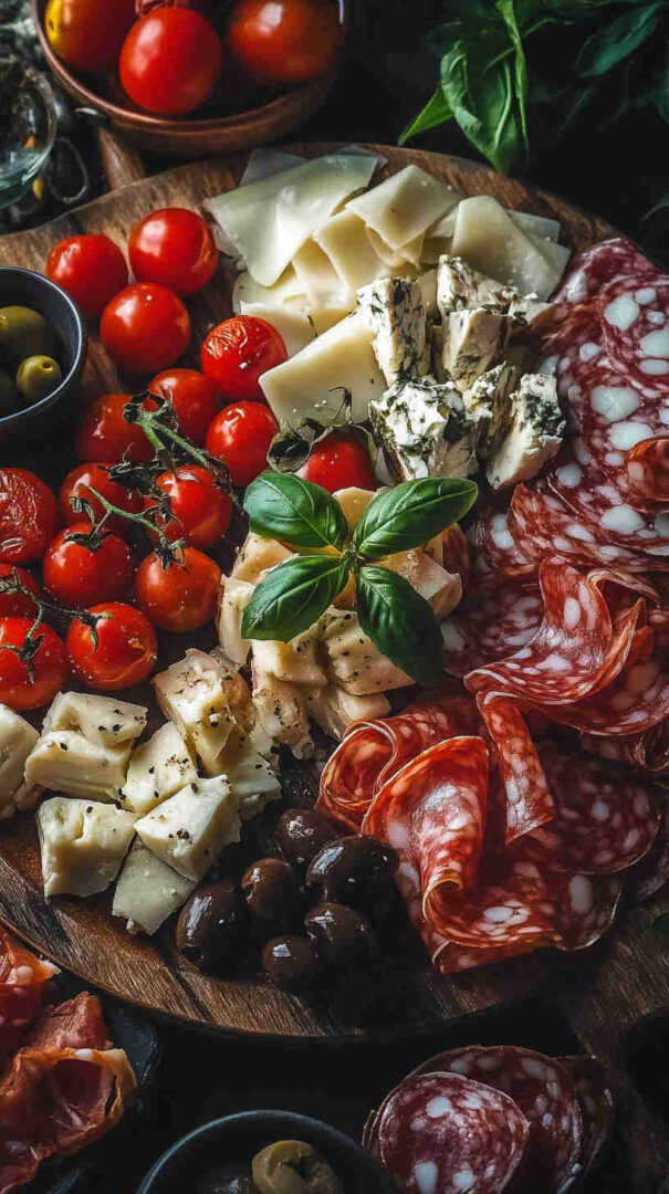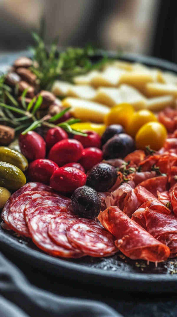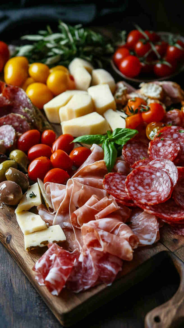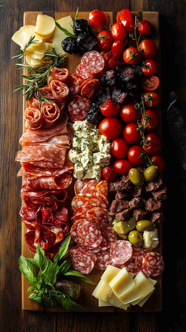 Start with high-quality Italian imports when possible — authentic Prosciutto di Parma (silky, not too salty), fresh fior di latte mozzarella (creamy and mild), and good jarred olives (Castelvetrano for bright green buttery flavor, Kalamata for deep richness).