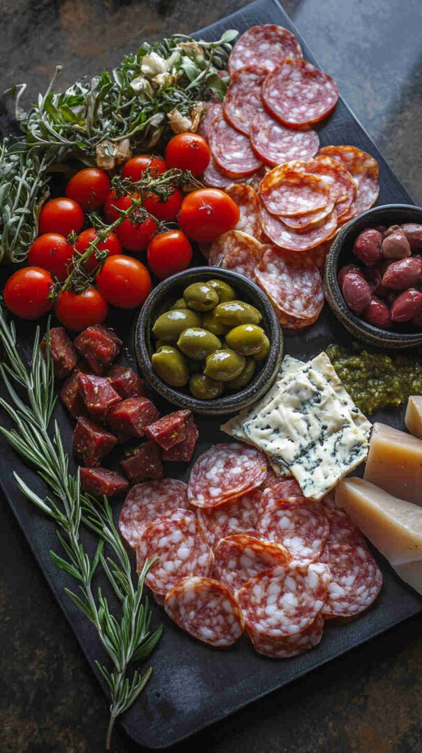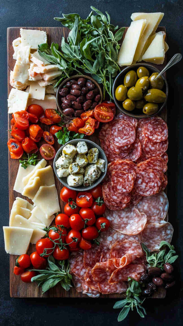 Use small bowls for olives, artichokes, and anything juicy to keep the board clean. Add height with rolled prosciutto roses, fanned salami, or standing breadsticks. Drizzle olive oil and balsamic glaze at the very end for shine.