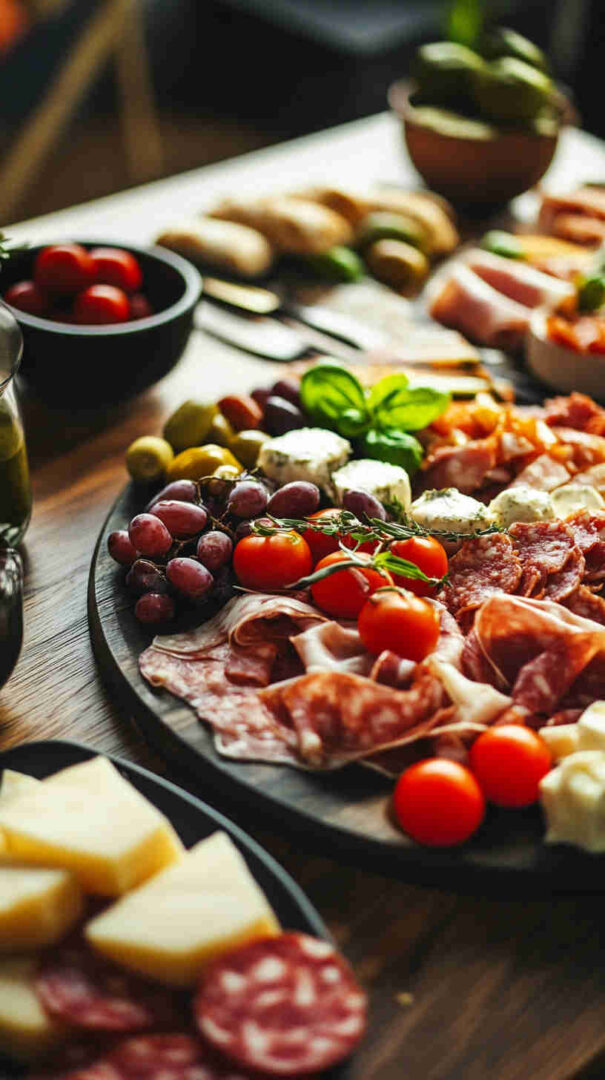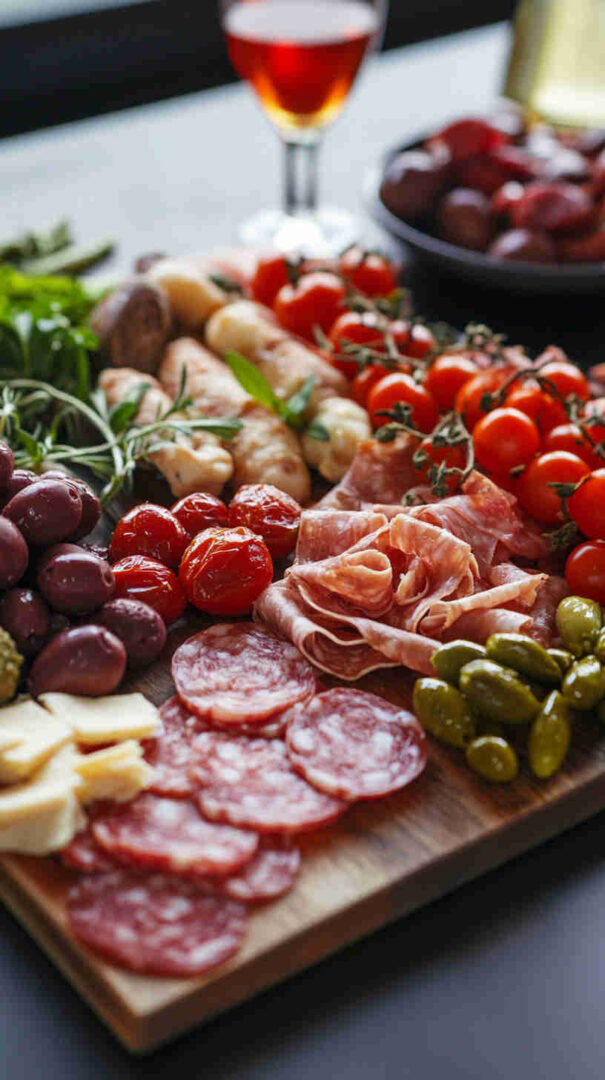 Add fresh fruit — figs, grapes, melon slices — for sweet contrast (classic with prosciutto). Go Greek-inspired with feta, dolmades, tzatziki, and oregano. For gluten-free, use rice crackers or gluten-free bread. Include seafood like marinated anchovies, sardines, or shrimp for coastal flair.