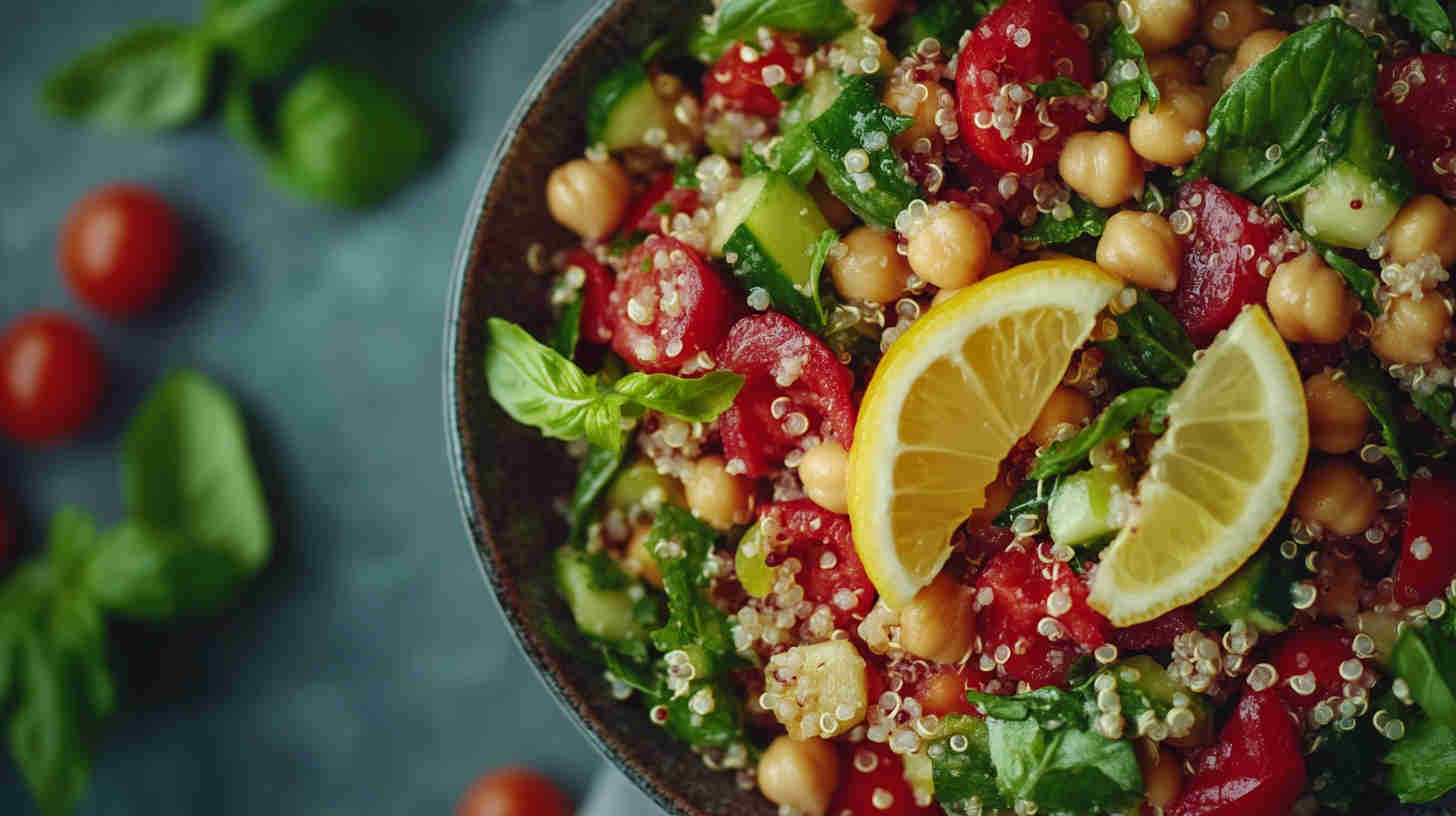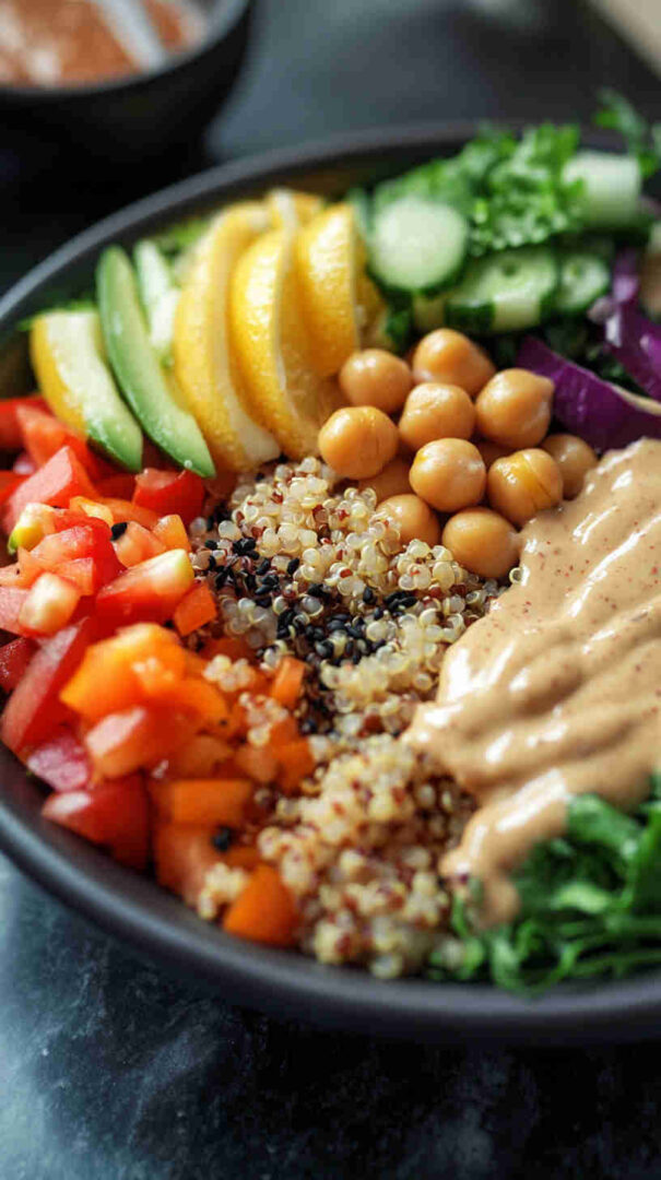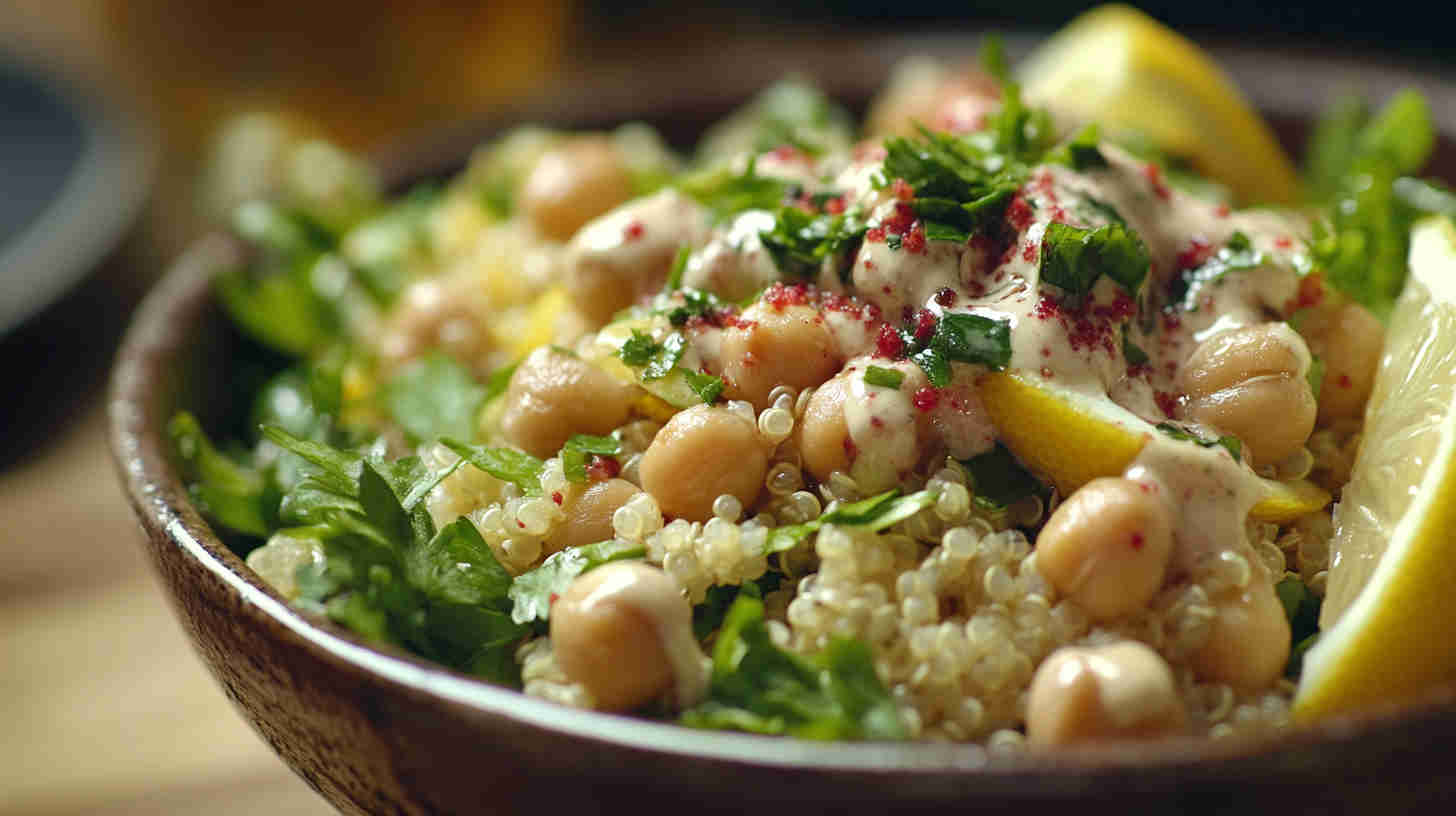 Fluffy quinoa, chickpeas, crisp veggies, and fresh herbs in creamy lemon-tahini dressing—bright, hearty vegan salad.